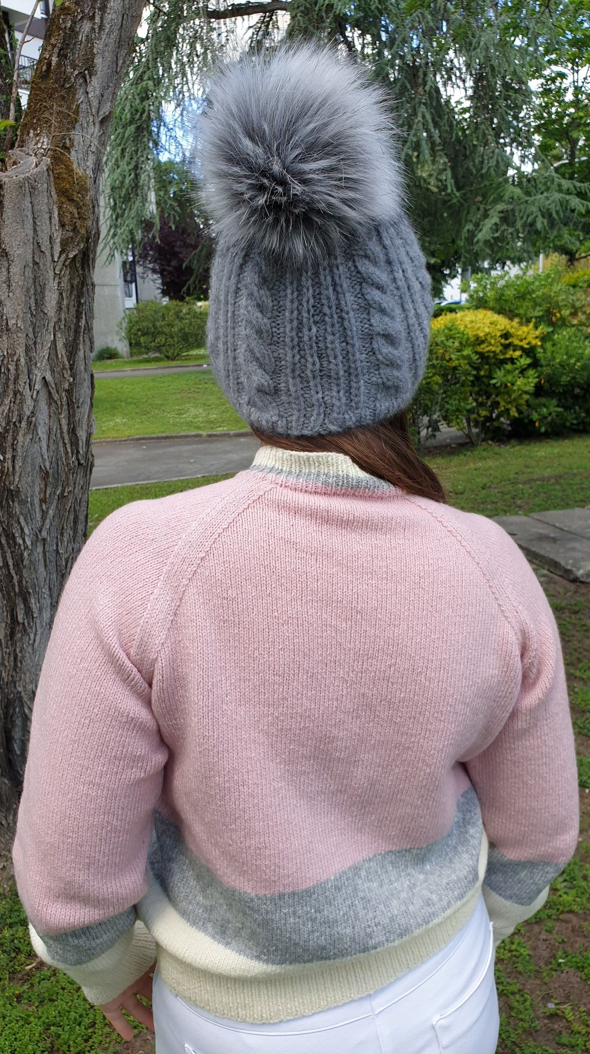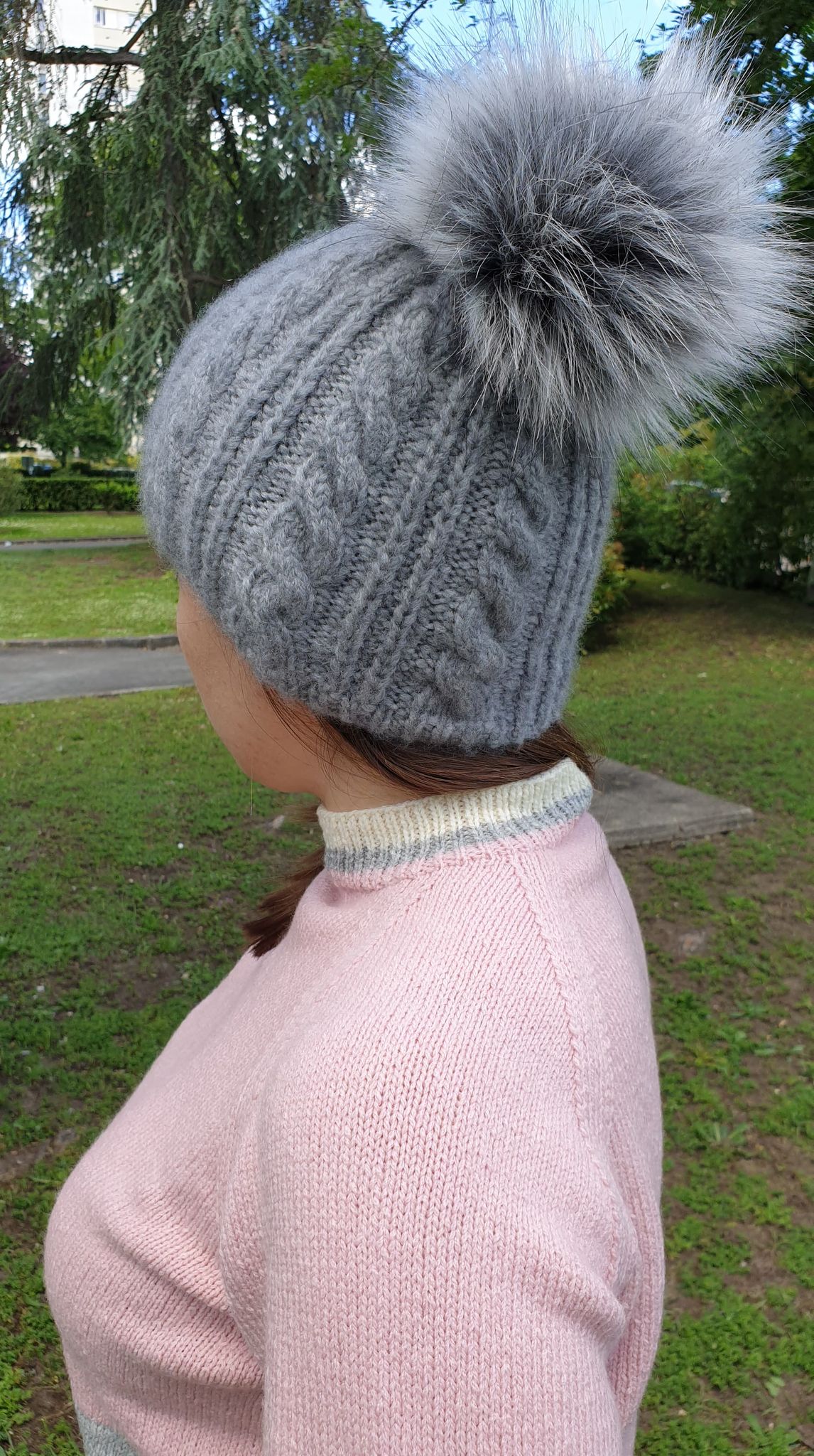 J’y ai ajouté en plus un pompon Lovafur en fausse fourrure dans les mêmes tons de couleurs. Il se fixe à l’aide d’un nœud formé à partir de 2 rubans déjà attachés au pompon (non visibles à l’extérieur).