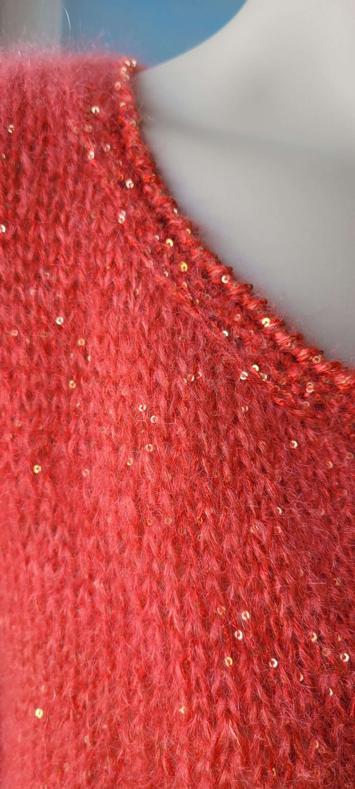 Il m’a fallu 10 pelotes de Mohair Luxe coloris 0029 de Lang Yarns, tricotée en fil double et 7 Paillettes de Lang Yarns coloris 0060. Le contour du cardigan est réalisé avec un point d’écrevisse au crochet en mélangeant les deux matières.