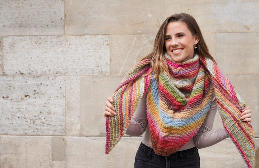 🍄🍁 Le premier jour de l’automne 2023 était hier, l’envie de laine sur nos aiguilles à tricoter se fait ressentir. La période de froid 🥶 les matins, nuits et soirs commence, alors un bel accessoire bien chaud, moelleux et coloré autour du cou est vivement recommandé ! La créatrice de modèles 👩 Judith Jelena Paus vous propose de tricoter un châle 🔽 triangulaire en 🧶 laine Orion de Lang Yarns (88% laine, 12% polyamide), aux coloris dégradés, avec une torsade centrale pour plus de fantaisie et d’originalité. Envie de reproduire le châle de Judith Jelena 👩 ? On vous explique tout, sortez vos aiguilles et votre laine ! 🧶