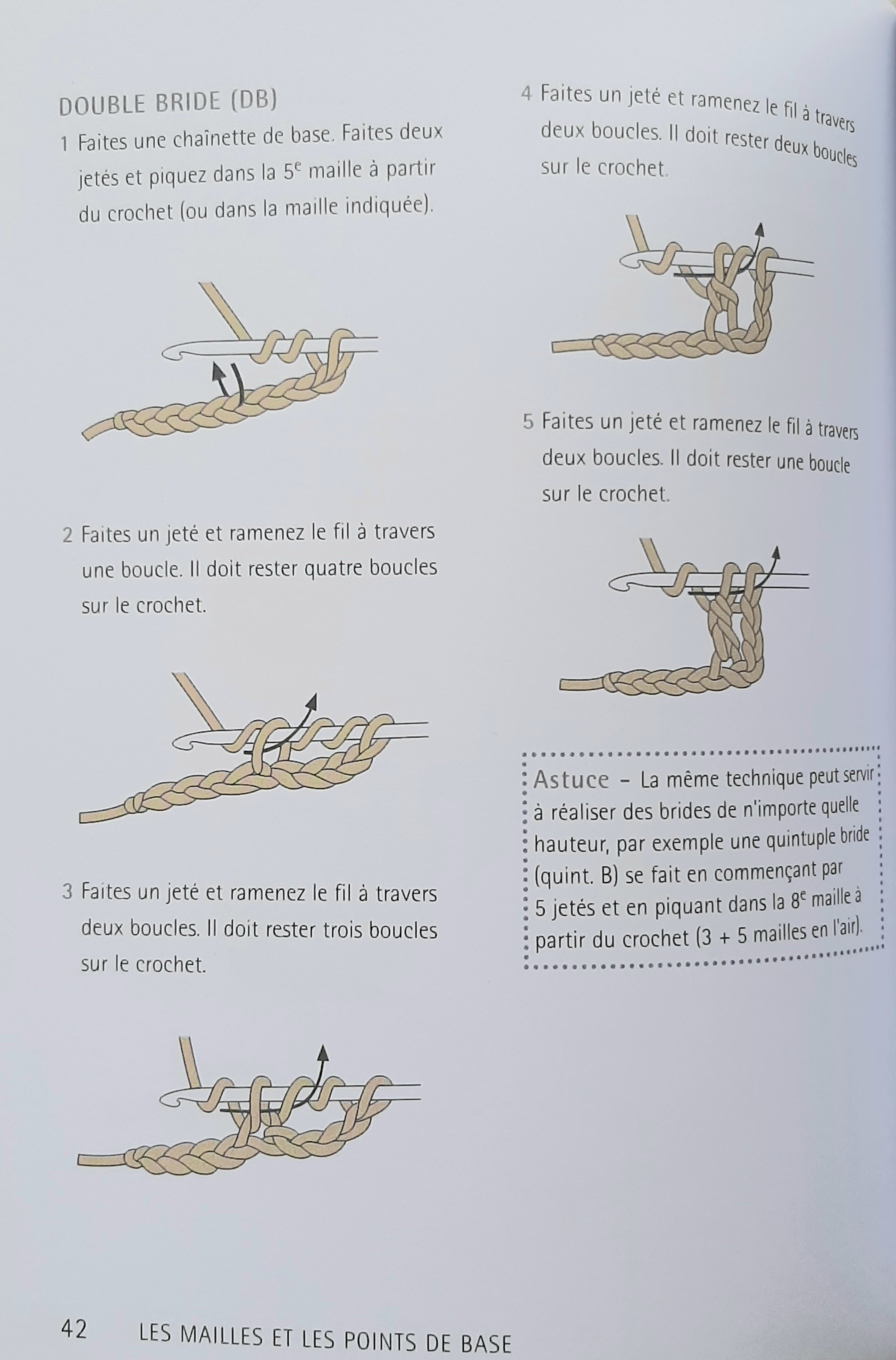 Les triples brides se font comme les doubles brides mais en commençant avec 3 jetés (enrouler 3 fois le fil sur le crochet). Idem pour les quadruples brides mais avec cette fois-ci, 4 jetés (enrouler 4 fois le fil sur le crochet) et ainsi de suite.
