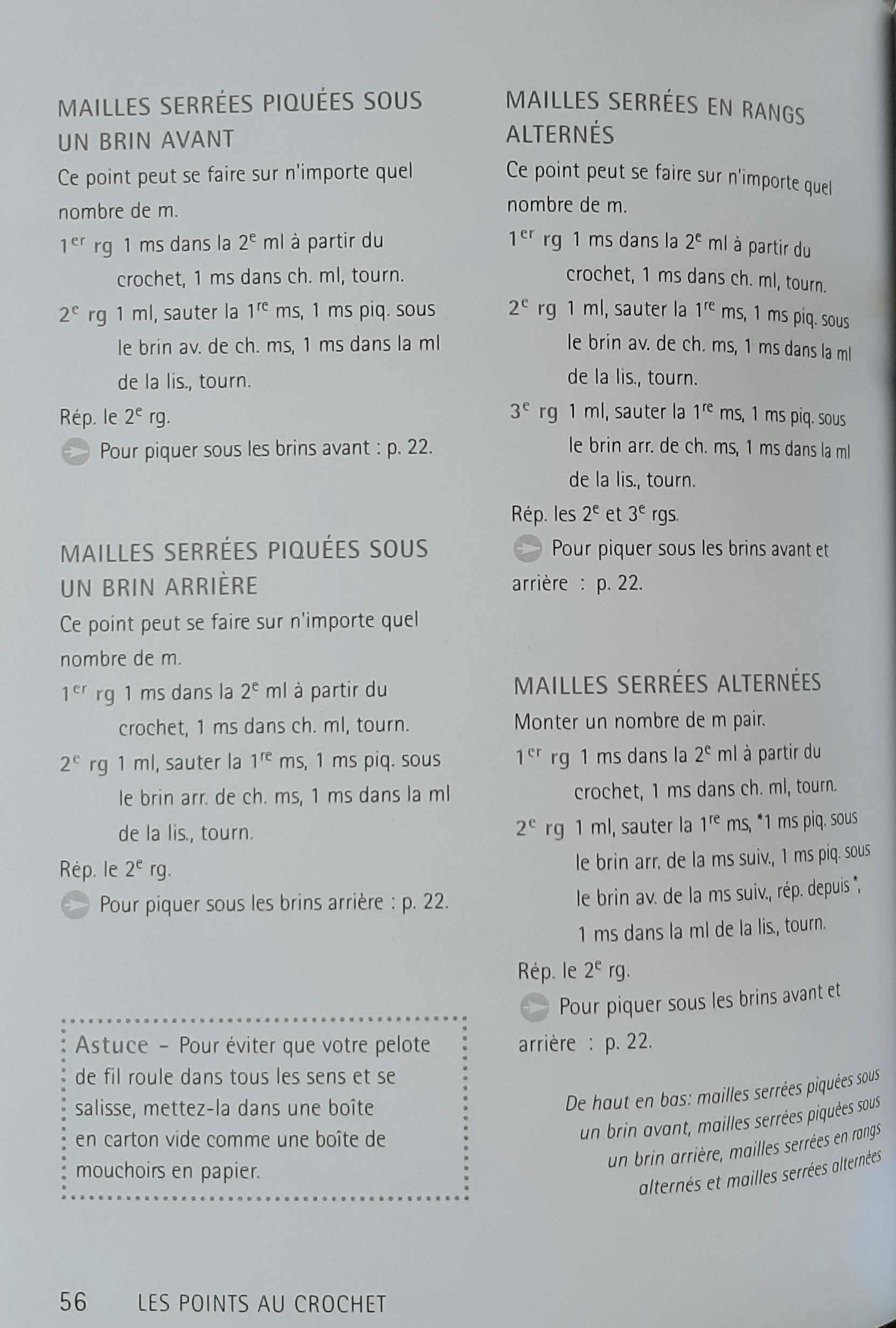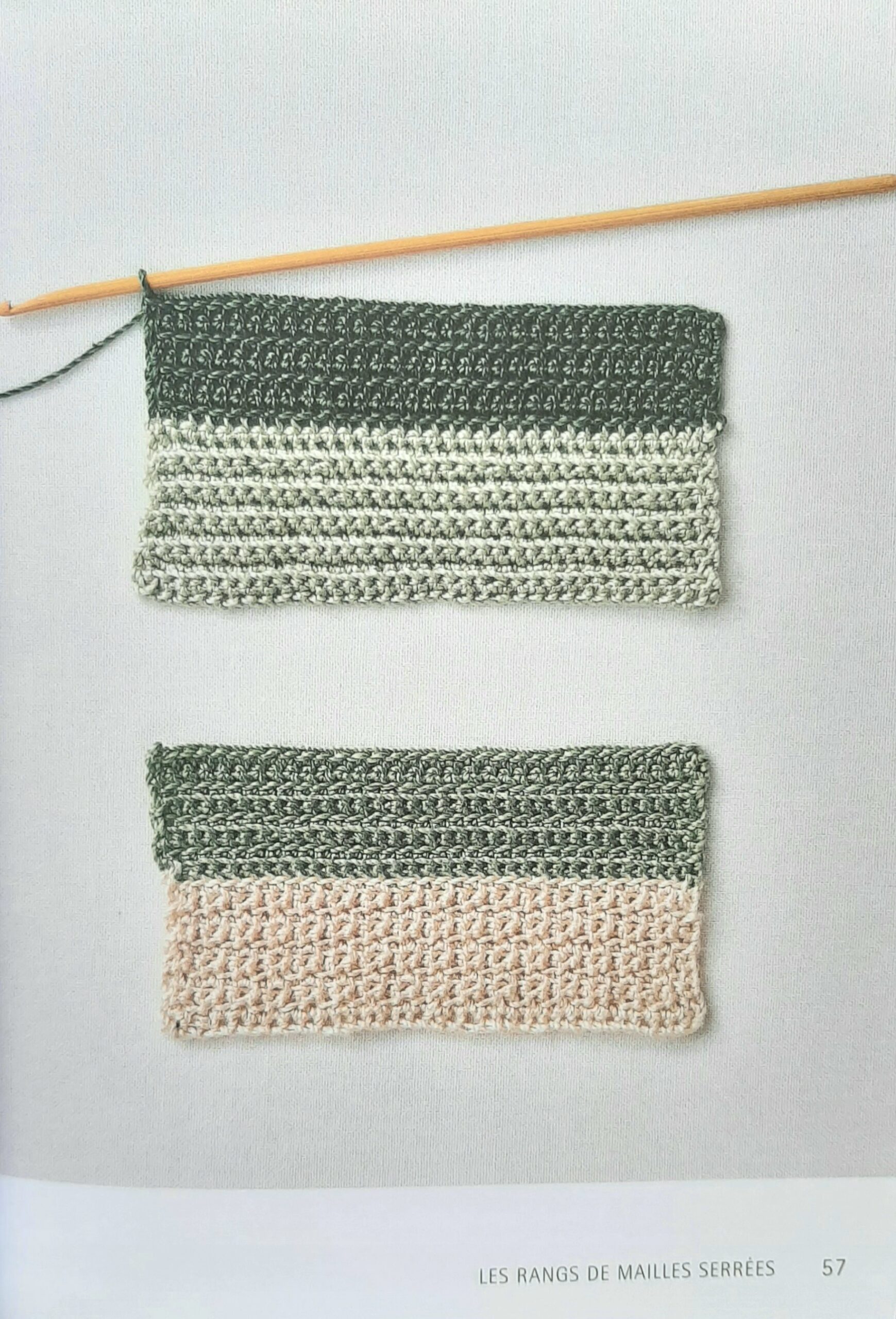 Il existe les mailles serrées classiques mais aussi les mailles serrées doubles, piquées sous un brin avant/arrière, alternées et en rangs alternés. Voici les explications des différents points ci-dessous :