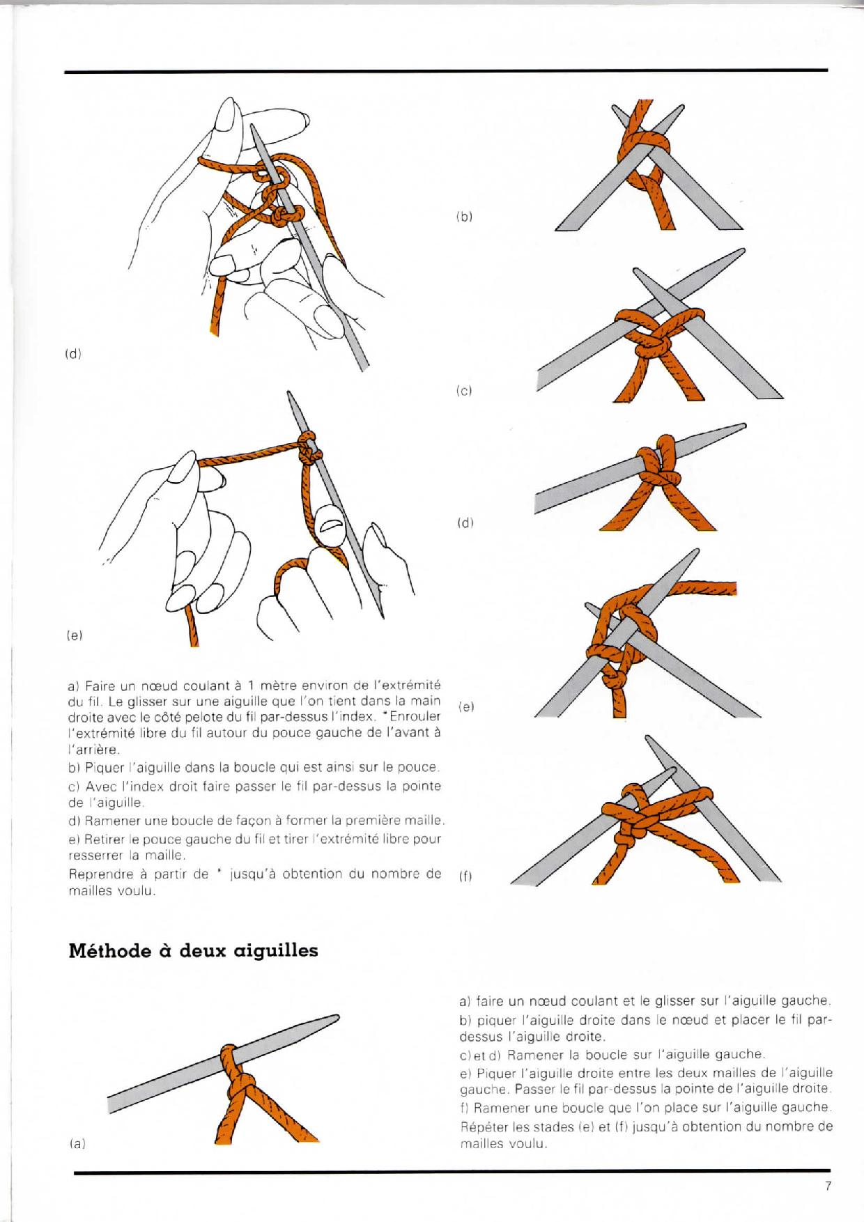 - Piquer dans cette boucle l’aiguille tenue dans la main droite: tendre le fil venant de la pelote sur l’index de la main droite, puis l’enrouler autour de l’aiguille droite en le passant par-dessous et au-dessus de celle-ci.