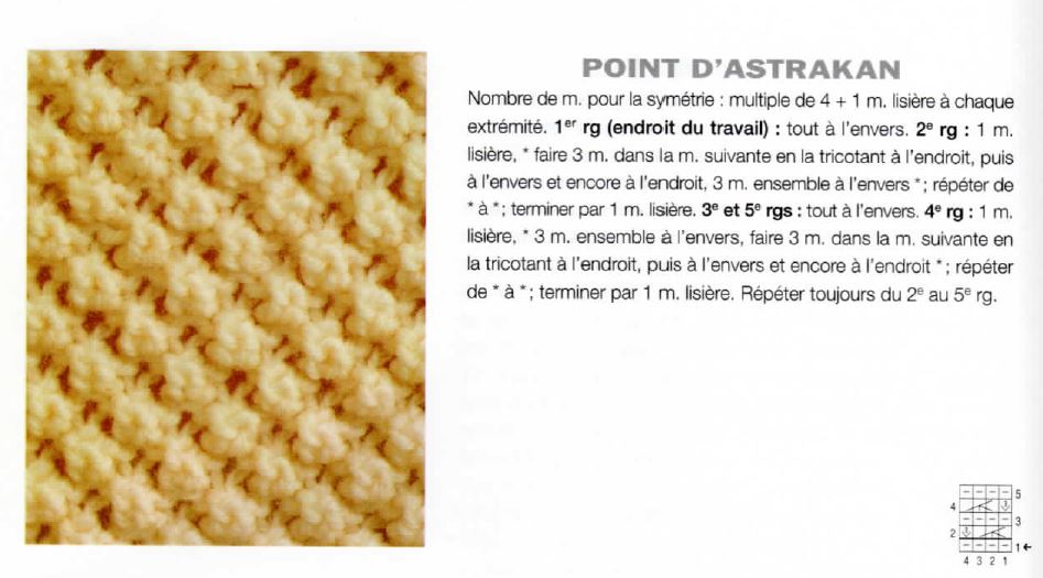 Le motif du point d’Astrakan se tricote sur une alternance de 4 rangs que l’on répètera toujours à l’identique.