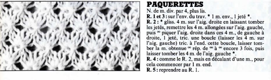 Rang 2: *glisser 4 mailles sur l’aiguille droite en laissant tomber les jetés, remettre les 4 mailles allongés sur l’aiguille gauche, puis ⛝ piquer l’aiguille droite dans ces 4 mailles, de gauche à droite, 1 jeté, tricoter une boucle (laisser les 4 mailles sur l’aiguille gauche) tricoter à l’endroit cette boucle, laisser tomber la maille obtenue ⛝, répéter de ⛝ à ⛝ encore 3 fois, puis laissez tomber les 4 mailles de l’aiguille gauche *.