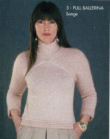 Dans le catalogue Bouton d’Or 89, vous trouverez un pull pour femme modèle n°3 Ballerina dont une partie des manches et le bas du corps est réalisé avec ce point, tricoté en laine Songe de Bouton d’Or – marque et laine française n’existant plus, je vous conseille de prendre à la place les laines Lang Yarns suivantes qui peuvent convenir pour le remplacement :