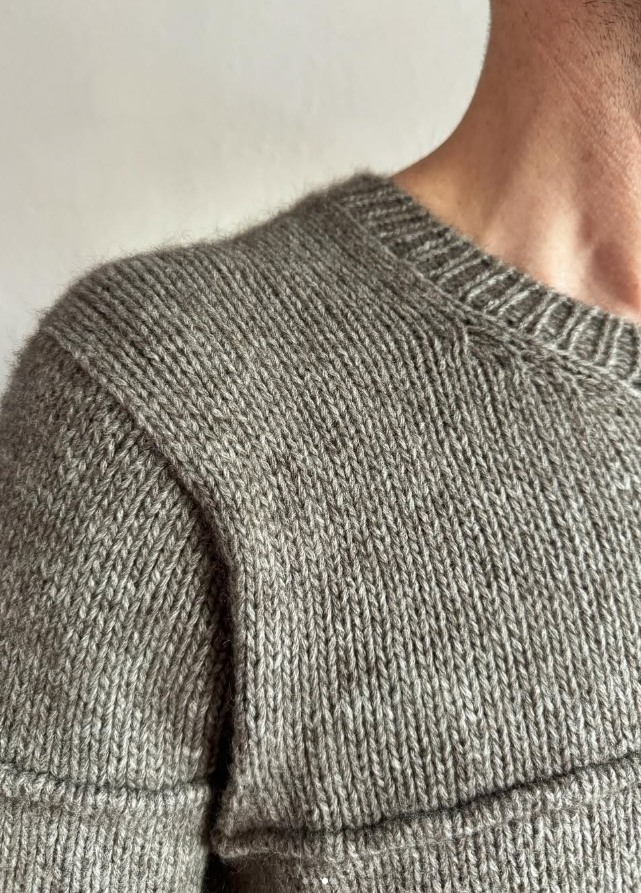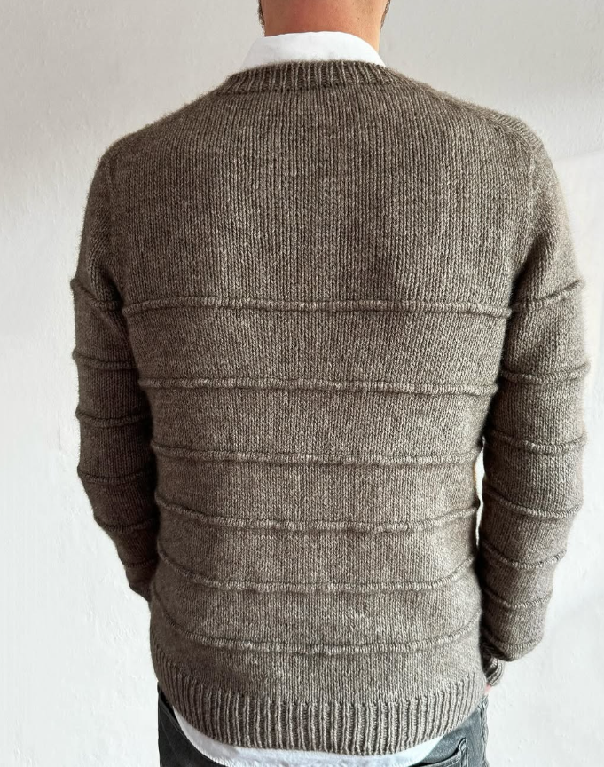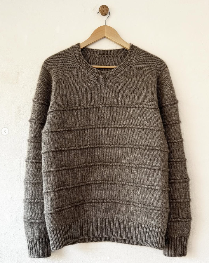 Sur le site www.makerswork.dk, vous trouverez le pull pour homme « Tuck Sweater Man » tricoté avec le point de plis, côtes 1/1 et du jersey endroit, en laine Yak de Lang Yarns coloris 0026.