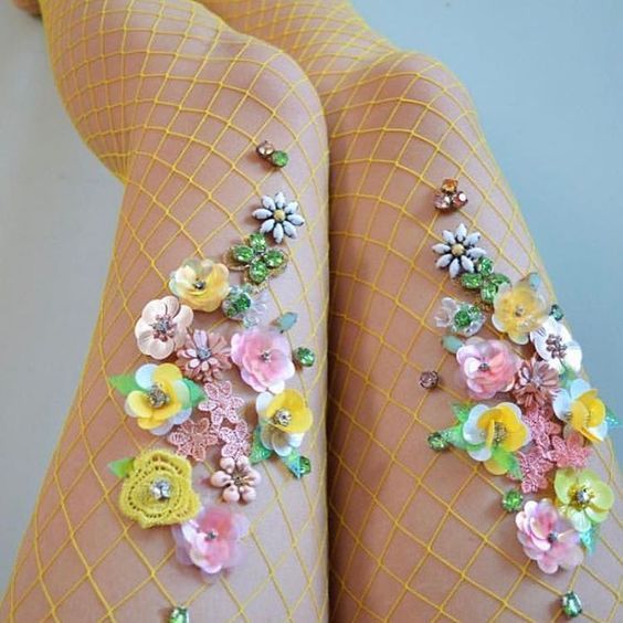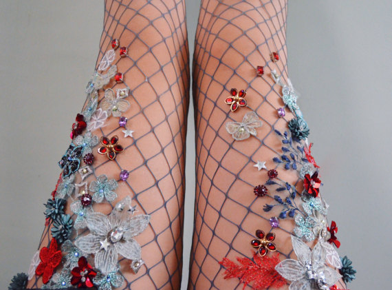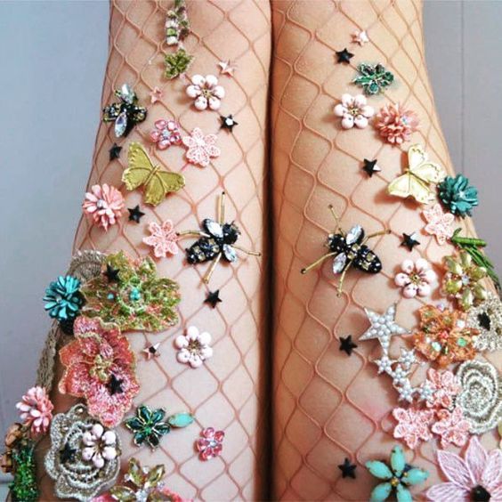 Amoureuse de la résille et des bijoux, la créatrice Lirika Matoshi combine à merveille ces deux éléments pour confectionner des bas résille uniques :