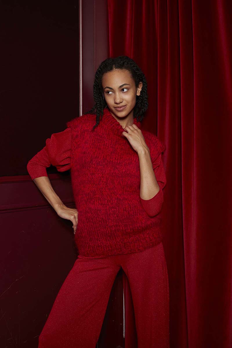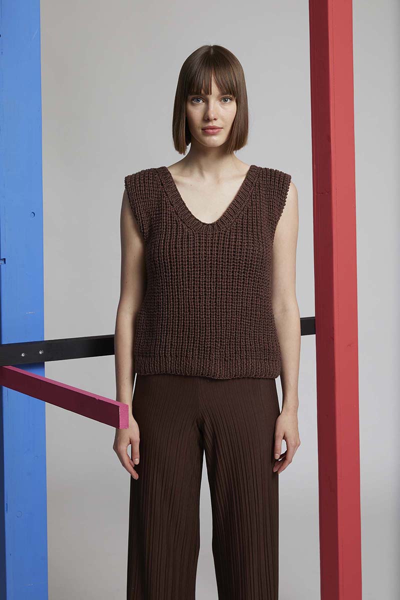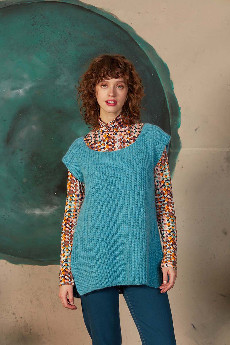 Ce débardeur, modèle Lussia d’Anny Blatt est ceinturé. Il est simple à tricoter: jersey endroit et point de riz. L’encolure est ronde sur le devant et forme un V dans le dos.