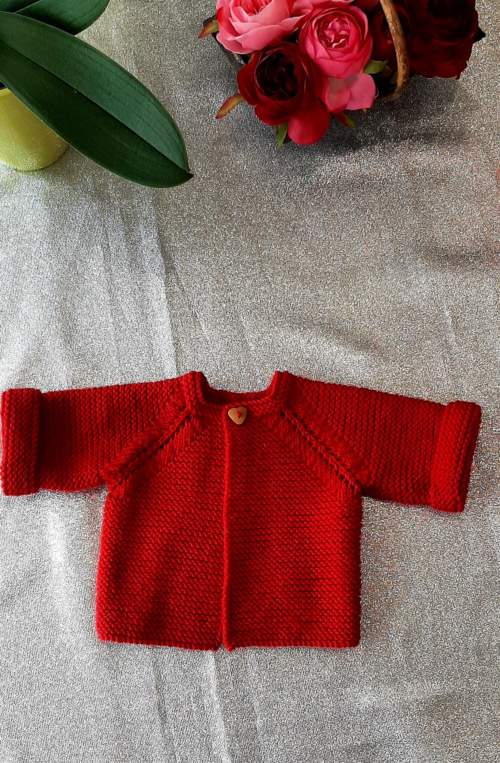 Le modèle rouge est disponible en kit tricot sur notre site web: https://www.ladylaine.net/kit-tricot-merino-120-n-1-gilet-bebe
