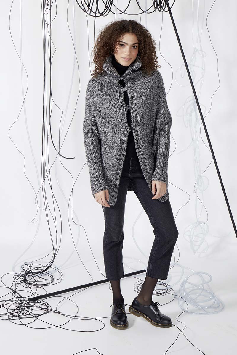 Taille 2 (S): 17 pelotes de laine Légende coloris Manoir de Bouton d’Or + 1 pelote de laine Cocoon coloris Noir de Bouton d’Or