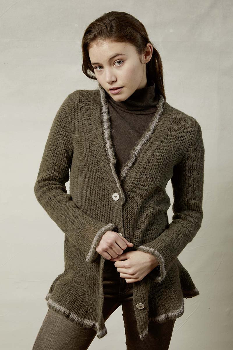 Taille 1 (14 ans): 16 pelotes de laine Légende coloris Manoir de Bouton d’Or + 1 pelote de laine Cocoon coloris Noir de Bouton d’Or