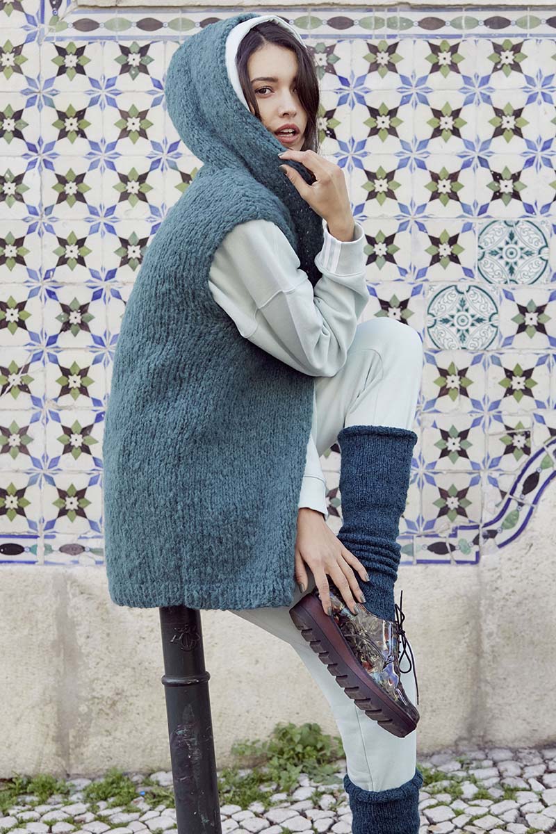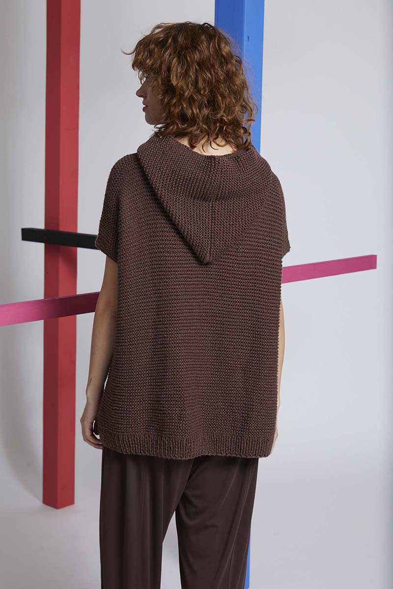 Monter 35/37/39/41 mailles aux aiguilles n°3,5 et tricoter au point fantaisie comme suit: *4 rgs de jersey endroit 2 rangs de point mousse*. Continuer ainsi au point fantaisie en augmentant tous les 4 rangs à droite: 1 maille /8/9/10/11 fois. A 13/15/17/19 cm, mettre en attente les mailles. Faire le même travail pour l’autre côté de la capuche mais en faisant les augmentations à gauche. Réunir les 2 côtés envers contre envers, et rabattre les deux morceaux ensemble. Coudre la capuche le long de l’encolure en mettant la couture à l’arrière. Coudre le sommet.