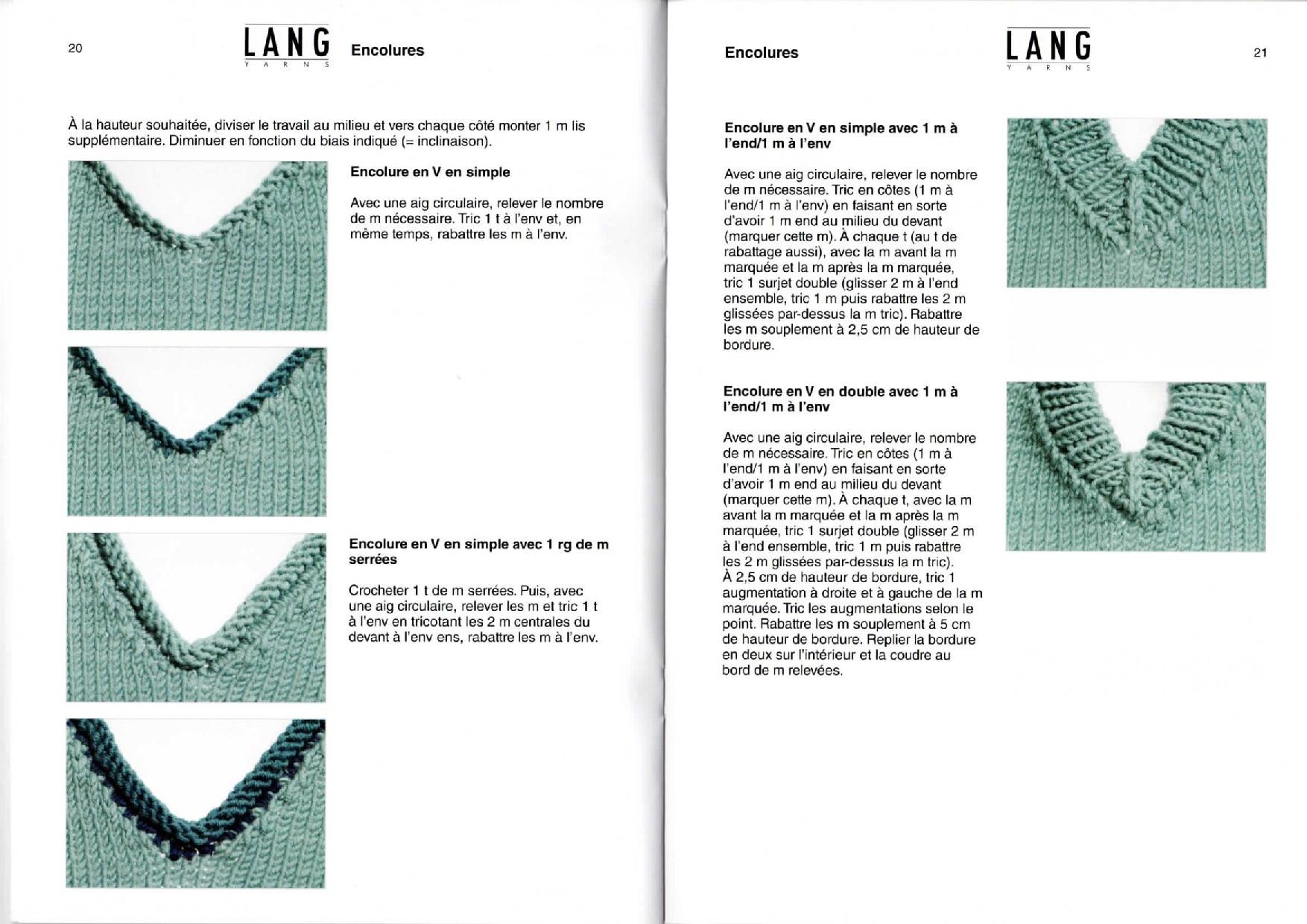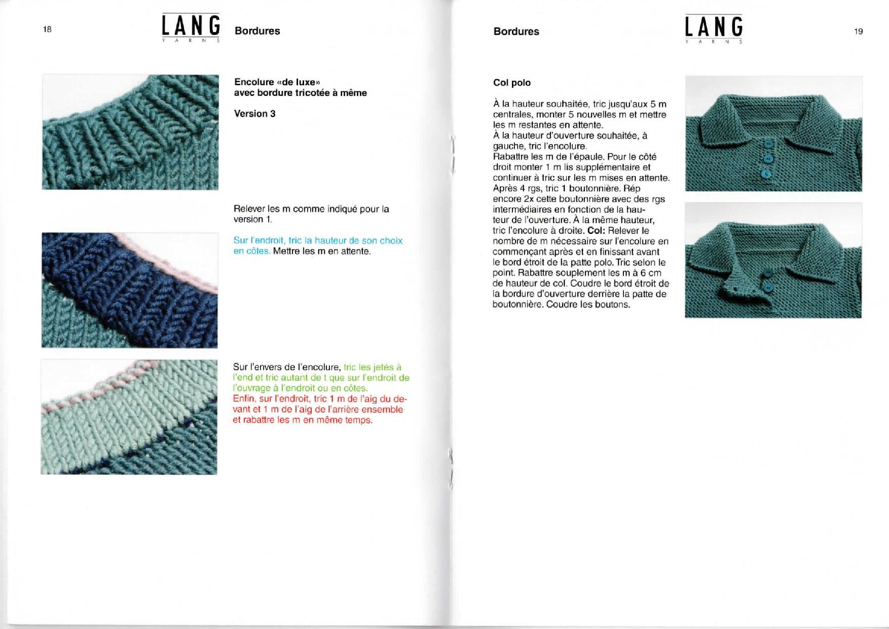 Voici quelques explications issues du manuel de tricot Lang Yarns partie 2 (les finitions) pour faire différentes encolures: encolures V, encolure bateau, encolure polo et pattes de fermeture.