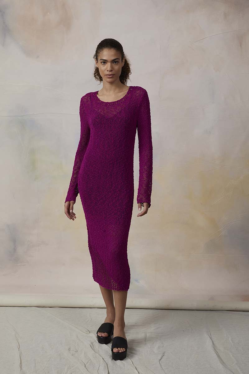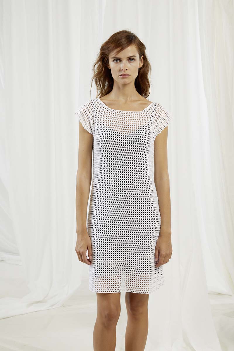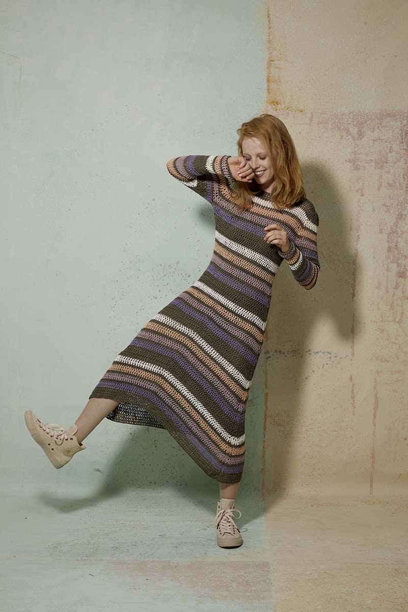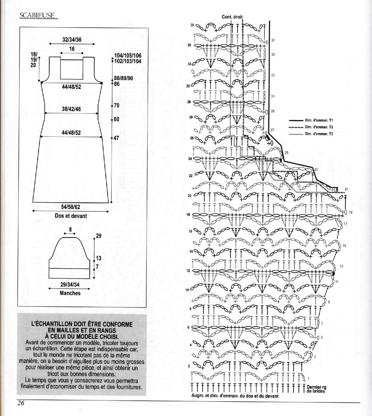 Cette robe, modèle Scabieuse d’Anny Blatt est crochetée en mailles serrées, brides, double brides et un point fantaisie. Elle mesure entre 104 et 106 cm selon la taille choisie.