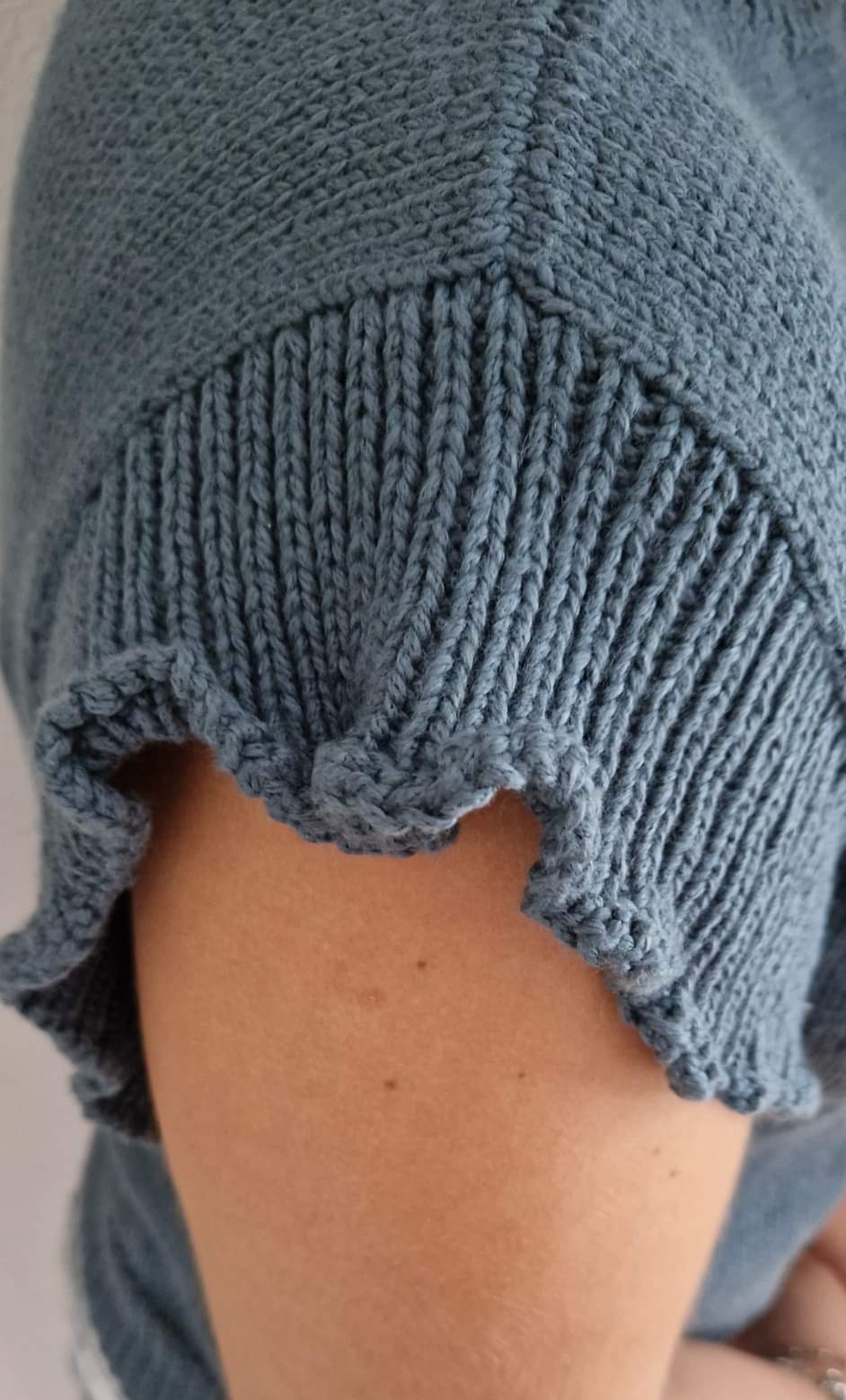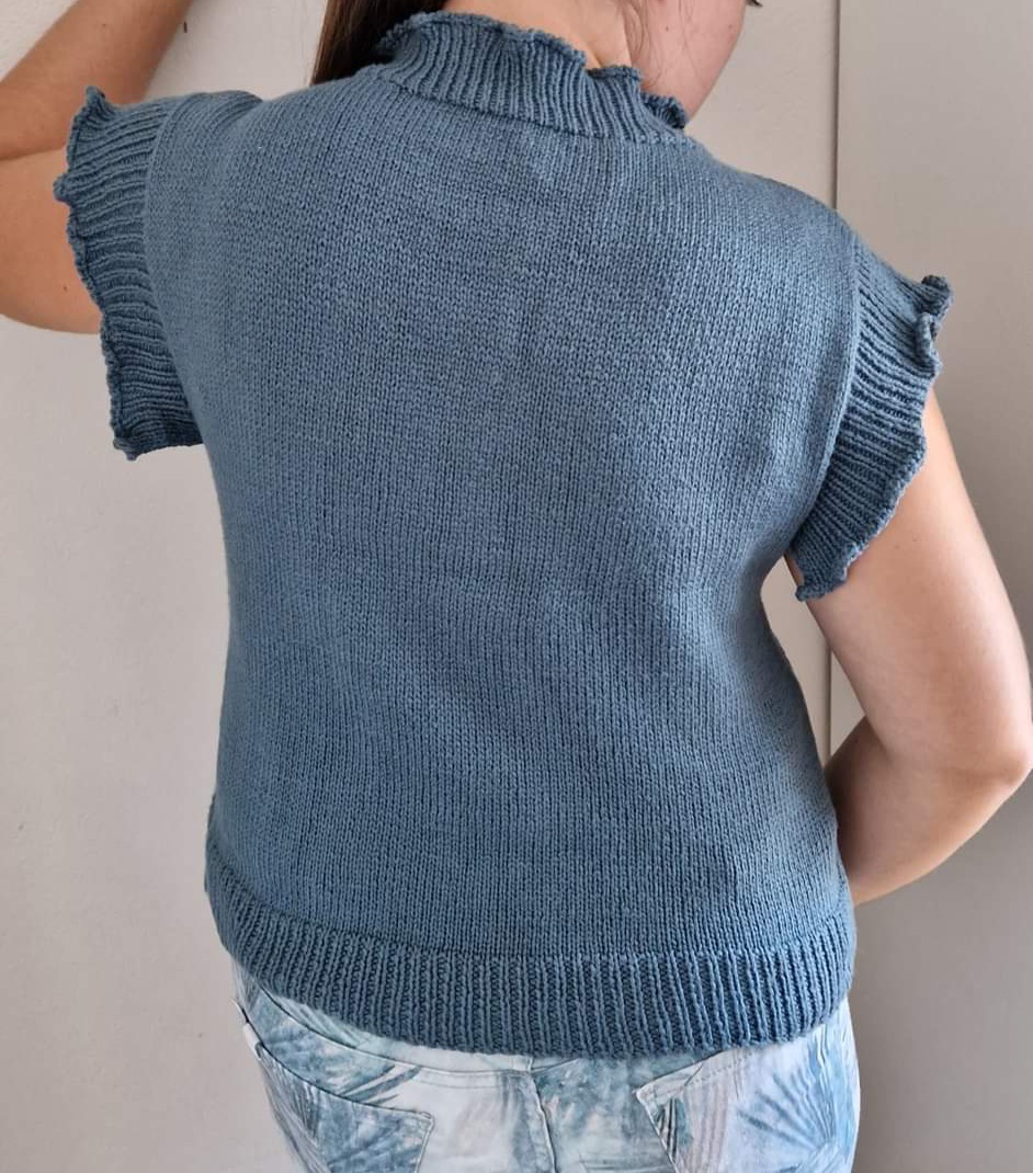 Ce modèle n°5 se trouve dans le catalogue Lang Yarns Punto 26 spécial coton Norma. Il est réalisé en jersey endroit et côtes 1/1. Sur mon modèle tricoté, les côtes sont aux aiguilles n°3.5 et le corps en jersey endroit aux aiguilles n°4. Les numéros d’aiguilles utilisés sont volontairement plus petites que les explications du catalogue (qui je trouve sont trop importantes en termes de numéros d’aiguilles utilisés), car j’aime un ouvrage plus serré. Le coloris utilisé pour mon débardeur est le bleu 959.0188. Celui du catalogue est le noir 959.0004.
