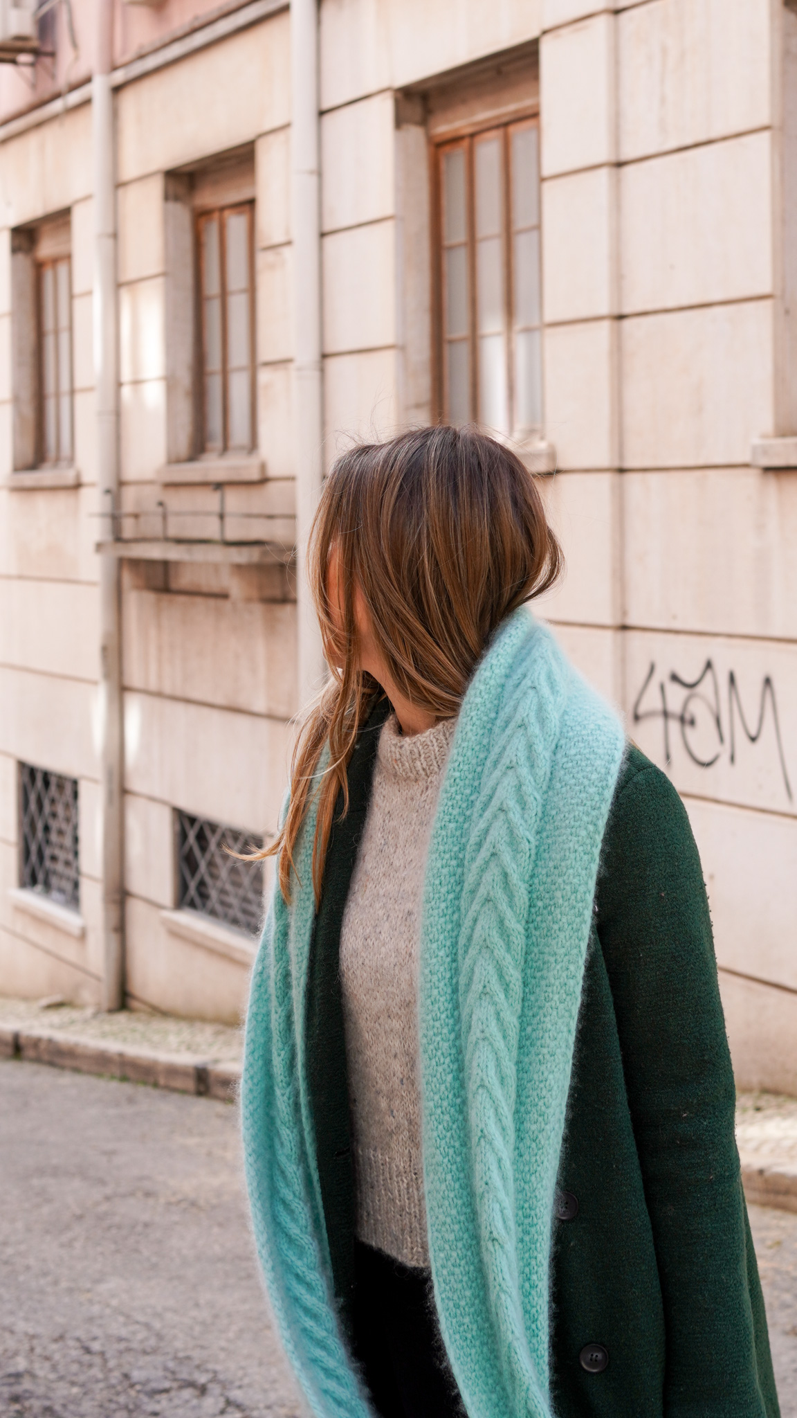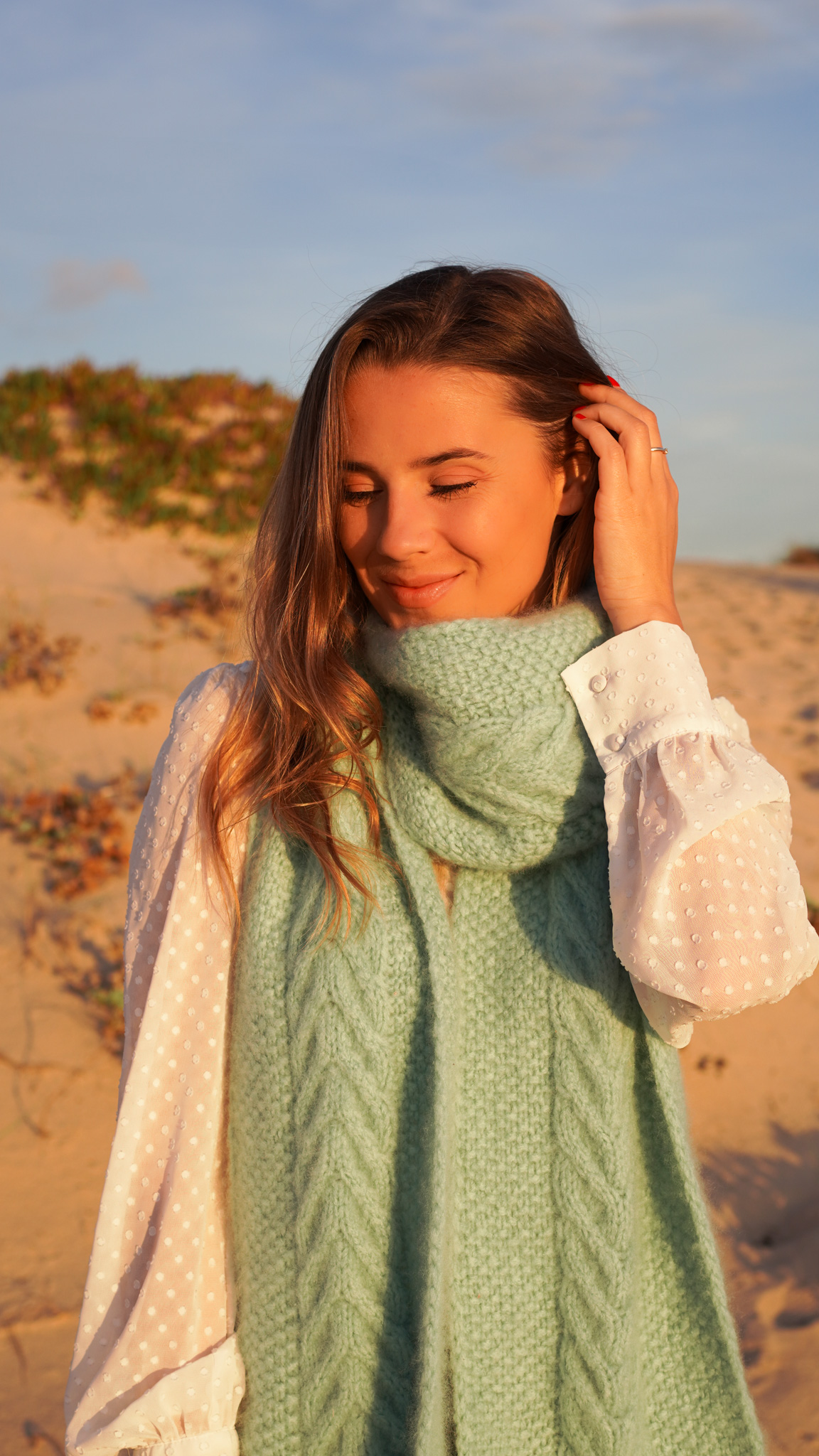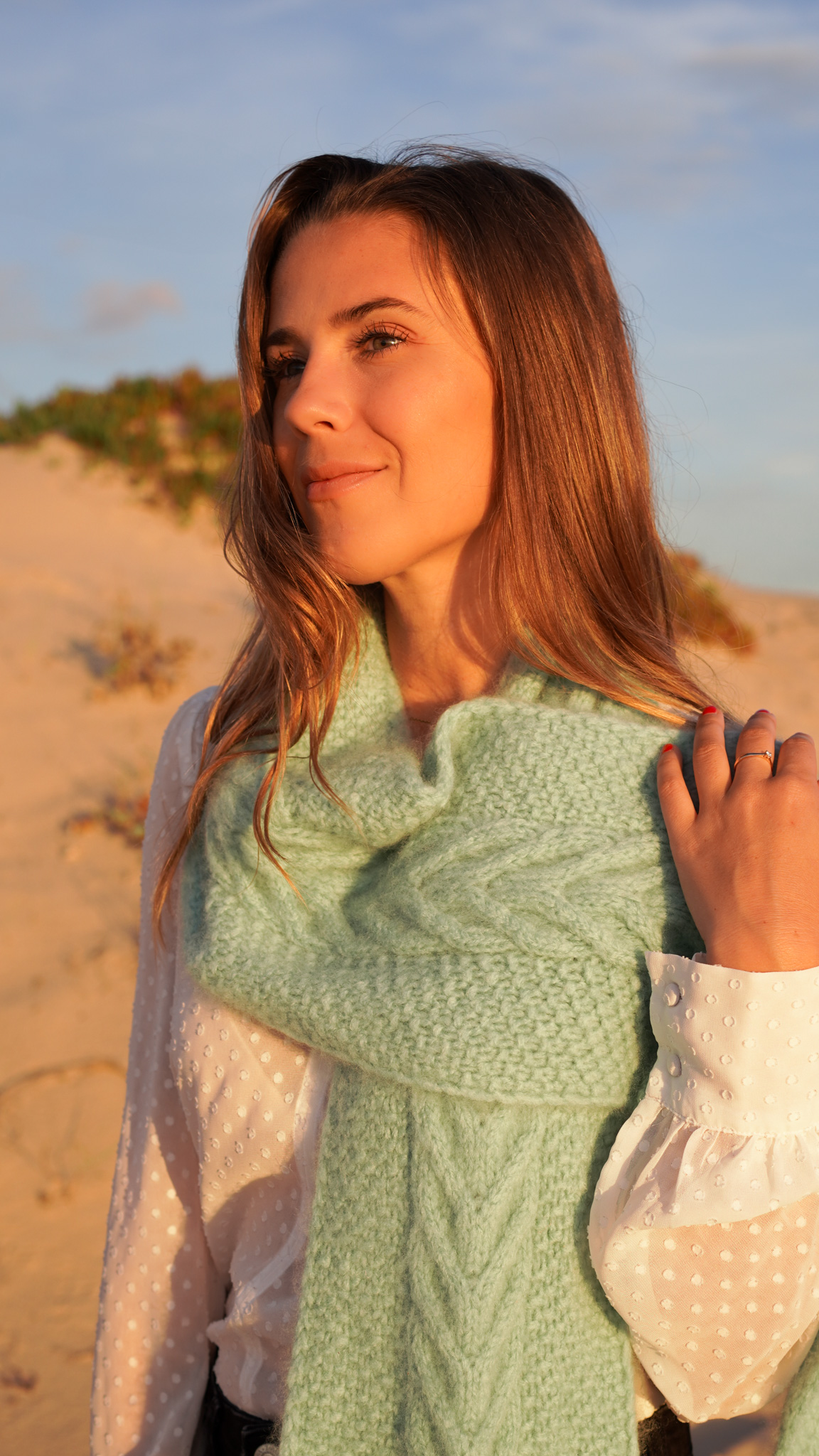 L’écharpe « Oceanvibes » est réalisée avec l’un des fils les plus doux et les plus nobles qui existent. Avec son design élégant, composé d’un motif perlé délicat et d’un motif torsadé central saisissant, cette écharpe évoque les vagues apaisantes de l’océan. Ses structures harmonieuses en font non seulement un accessoire stylé, mais aussi un compagnon indispensable pour toutes vos tenues d’hiver. Portée de manière décontractée sur les épaules ou élégamment enroulée autour du cou, l’écharpe « Oceanvibes » apporte une touche de charme marin à votre quotidien.