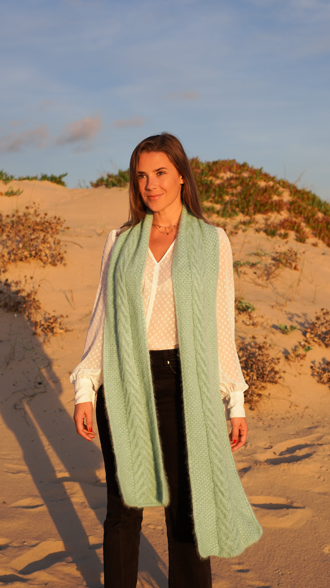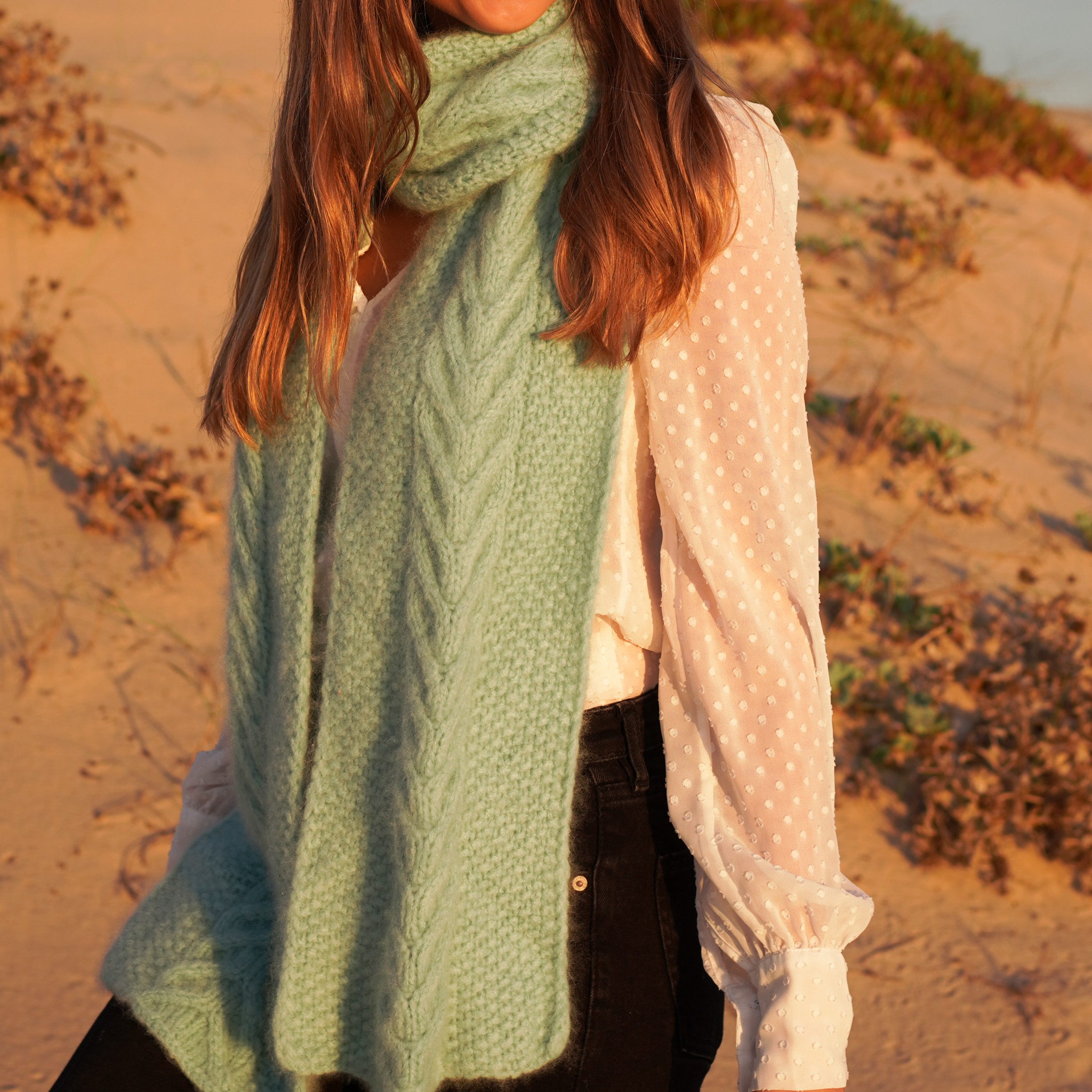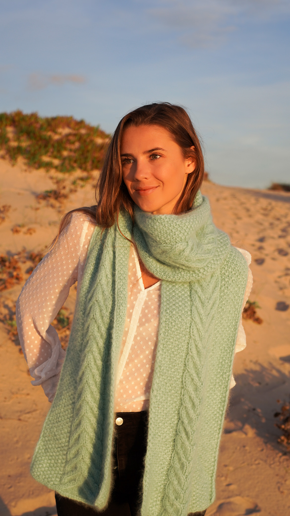 La torsade centrale de l’écharpe est la même que celle de son gilet et du pull Oceanvibes mais tricotée sur moins de mailles.