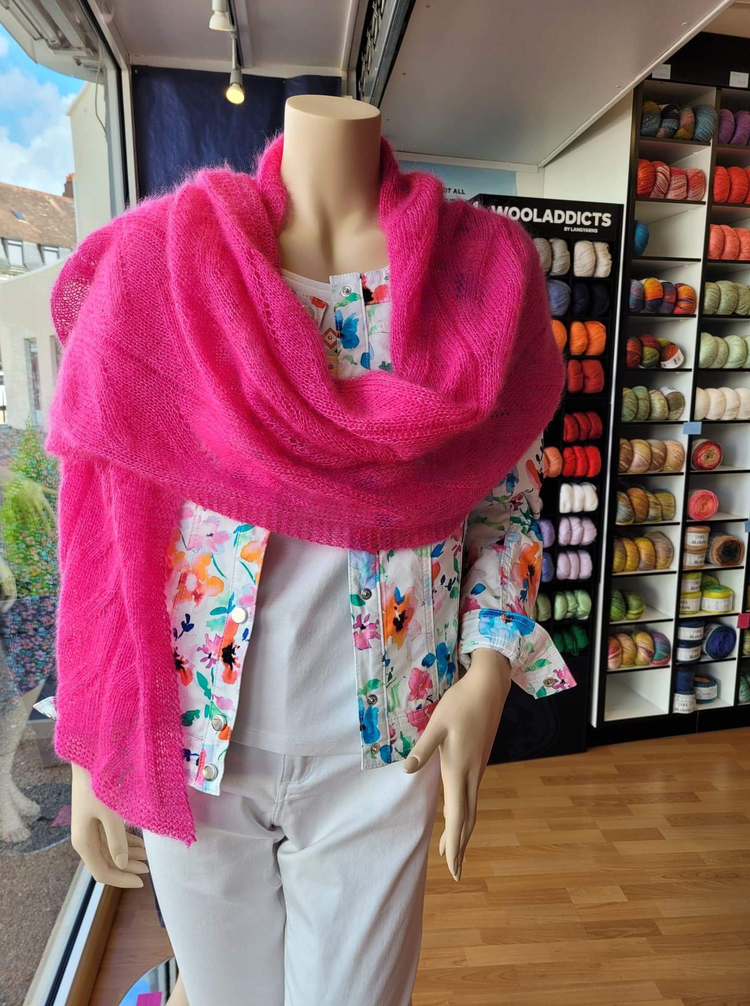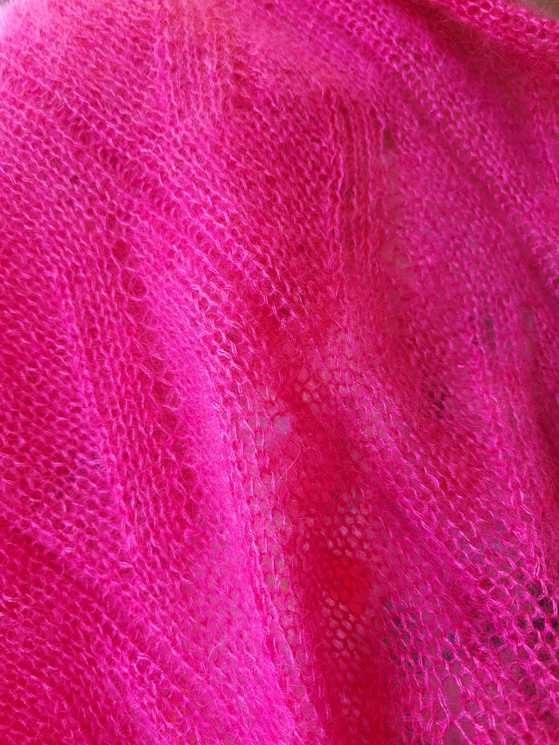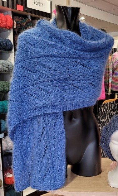 Une cliente, en voyant l’étole tricotée bleue en Mohair 21 de Lang Yarns, (photos ci-desous des étoles que j’ai réalisé en Mohair 21 et dans l’autre coloris rose, en Lace de Lang Yarns) dans la boutique m’a demandé de lui tricoter un gilet avec ce point.