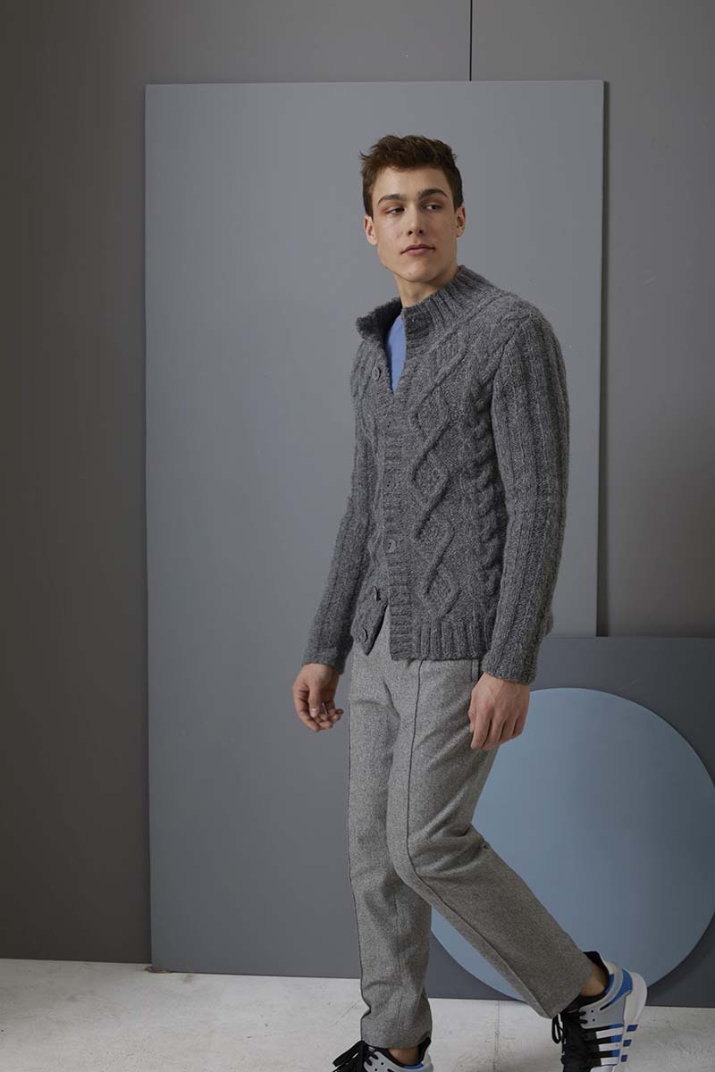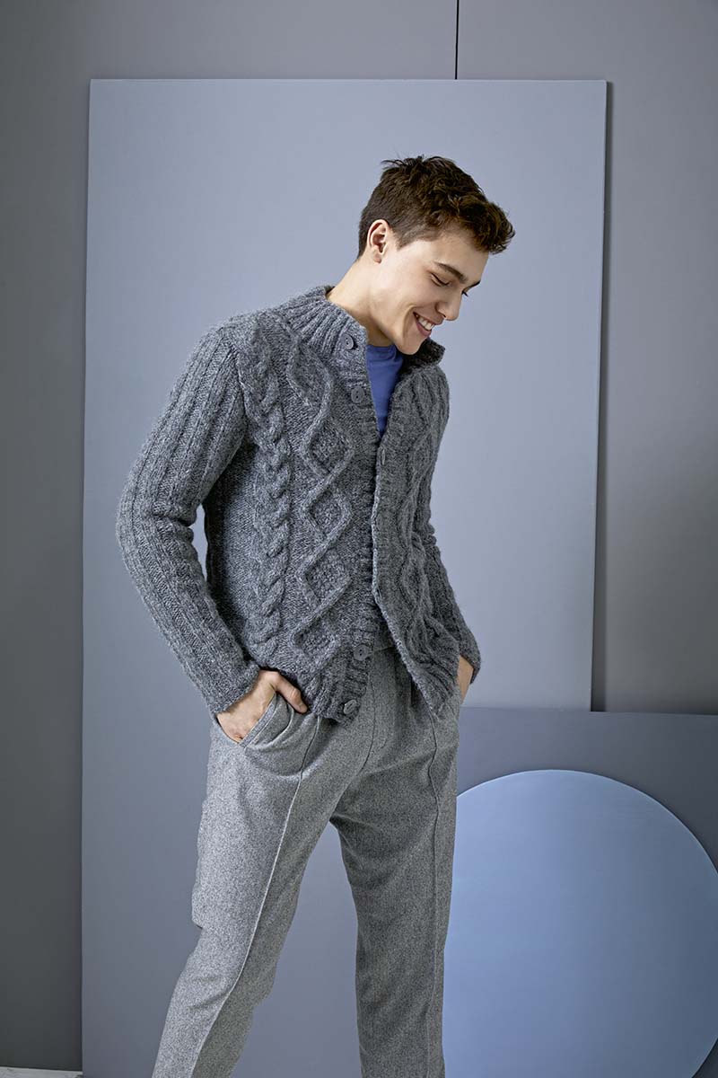 Vous trouverez ce joli gilet pour homme en laine Luna dans le catalogue Lang Yarns FAM 255, collection Automne-Hiver. Le modèle est fait d’une torsade simple sur 8 mailles dans le dos, d’une torsade double sur 12 mailles sur les deux devants ainsi que d’une torsade en forme de losange en mailles croisées sur 24 mailles.