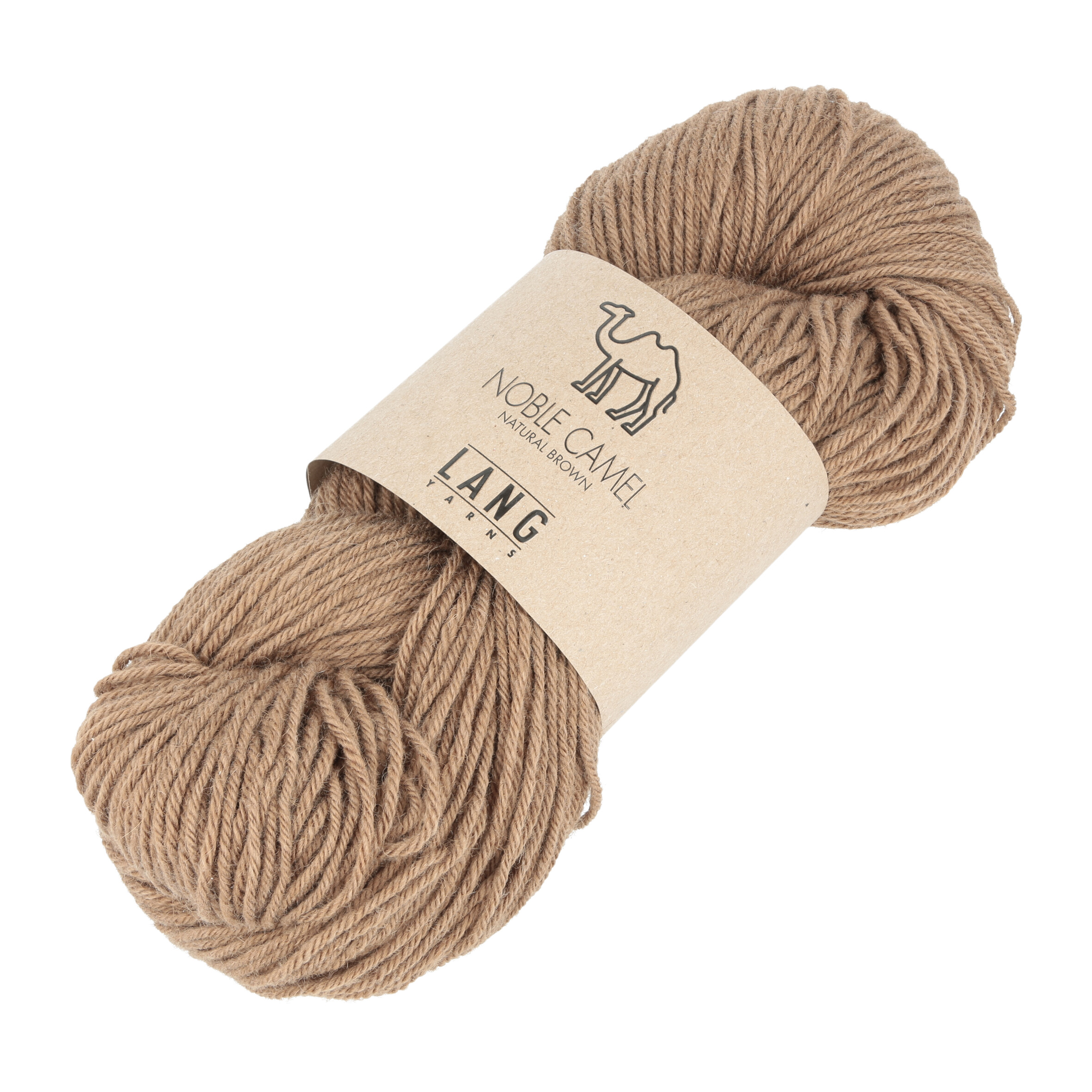 - Noble Camel: 100% poils de chameau, pelote de 200 m pour 100 gr. Elle se tricote aux aiguilles n°4.5-5, disponible dans 1 teinte naturelle. (Laine n’étant plus vendue par Lang Yarns depuis décembre 2024.)