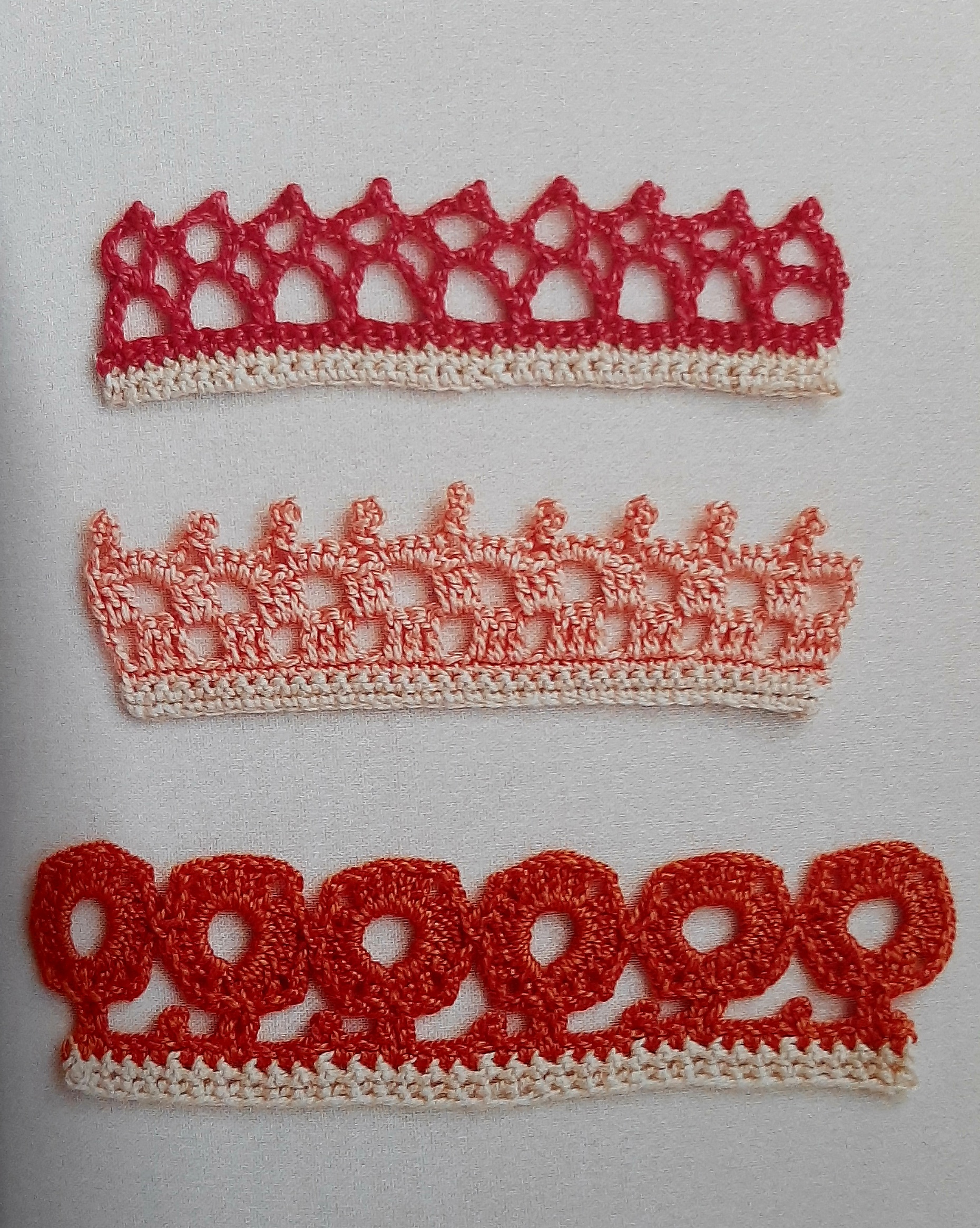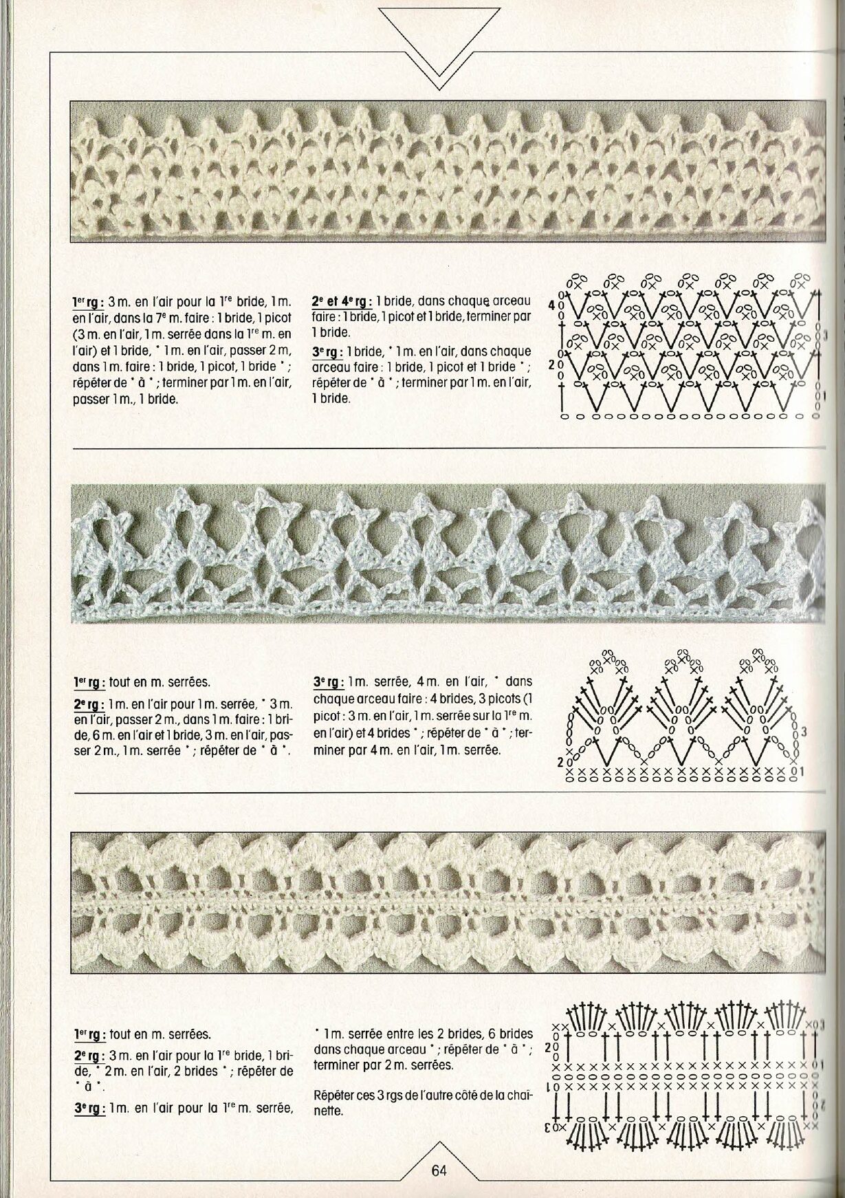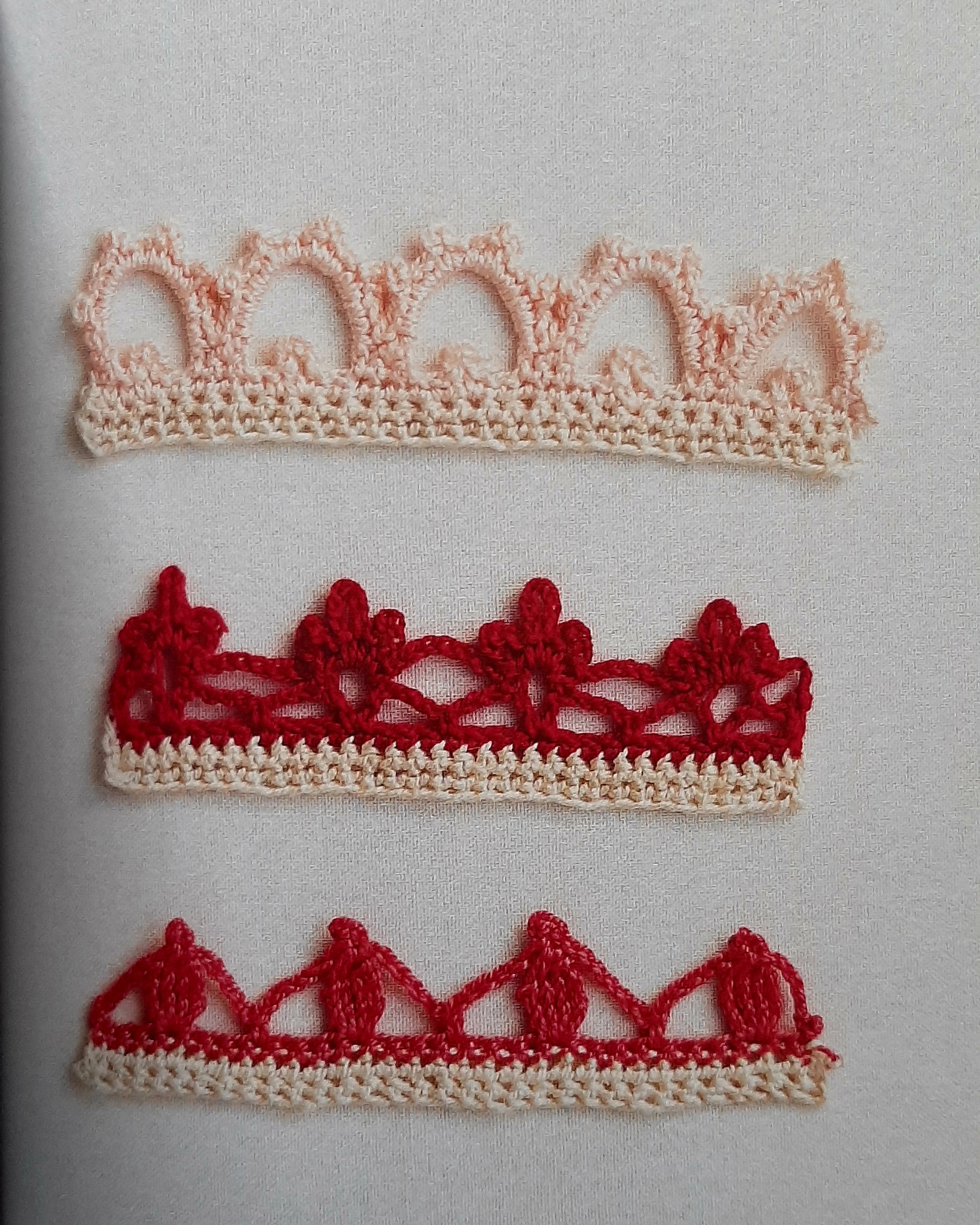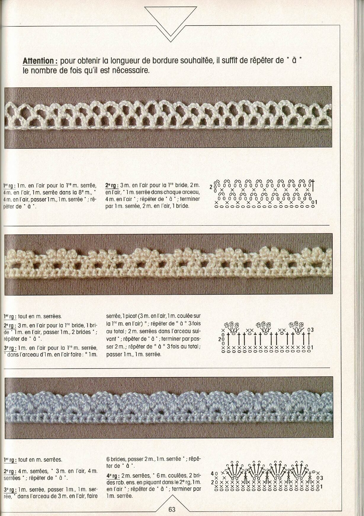 Vous trouverez ci-dessous des images de bordures au crochet plus sophistiquées. Si vous souhaitez les réaliser, nous vous invitons à nous contacter ou bien vous procurer le livre « Le crochet en 180 points », Editions Marabout, avril 2019 dans lequel se trouvent les explications (non disponible à la vente en boutique Ladylaine). Il n’y a pas de noms spécifiques à ces bordures.