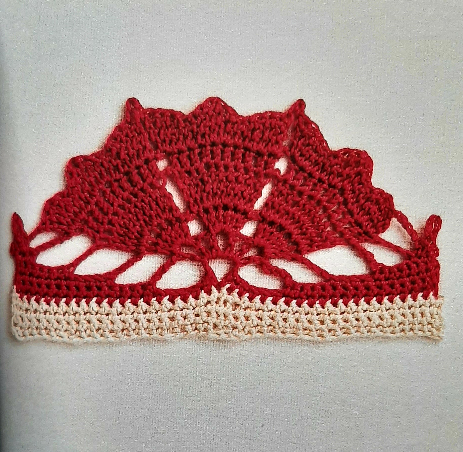 1er rang : 1 maille en l’air, 1 maille serrée dans chacune des 2 mailles suivantes, *1 maille serrée allongée dans la maille suivante, 1 maille serrée dans chacune des 3 mailles suivantes *, répéter de * à *, arrêter le fil.