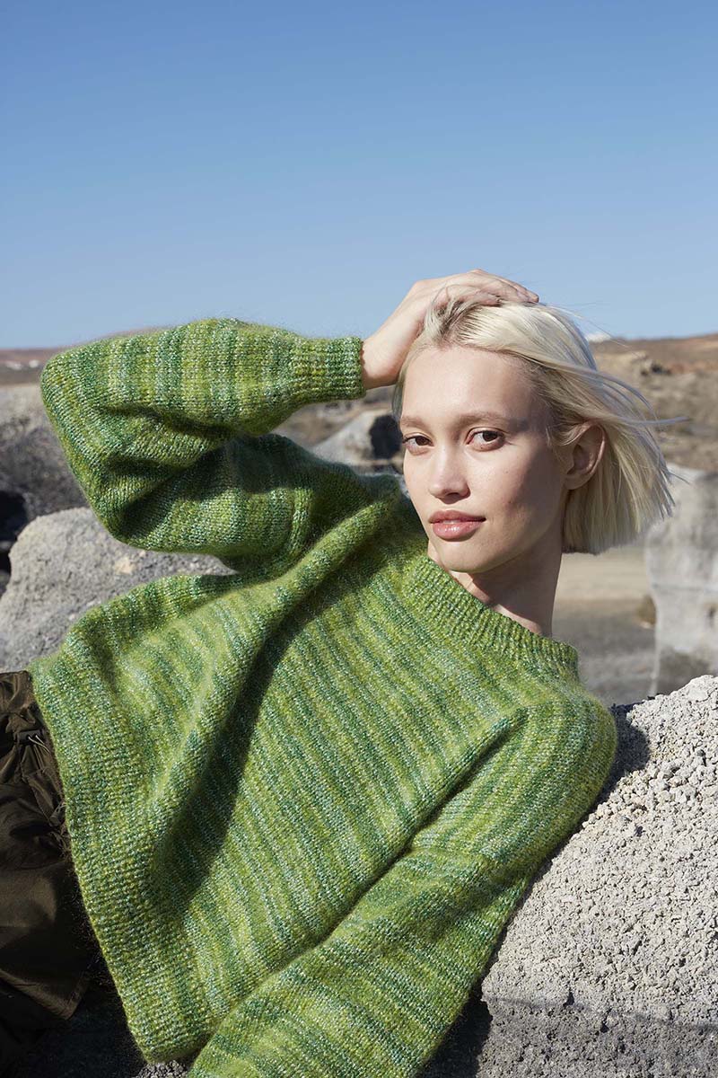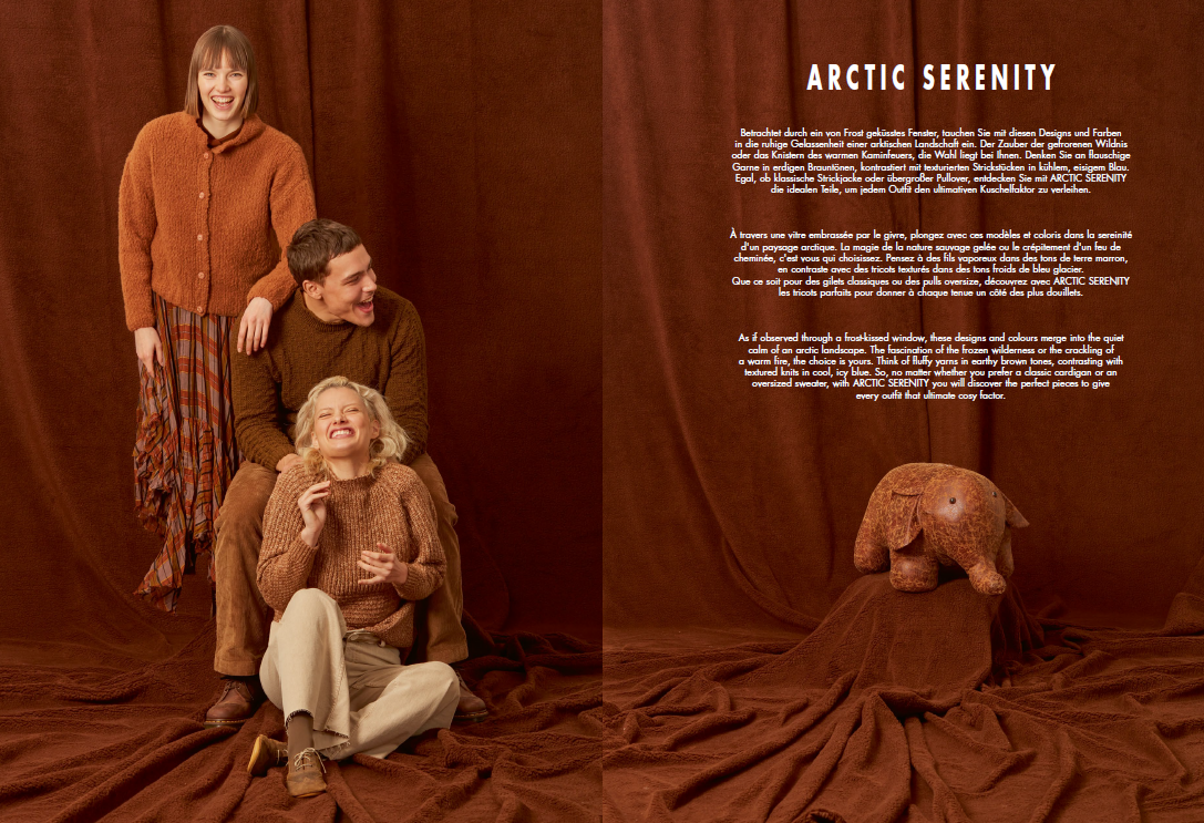 “À travers une vitre embrassée par le givre, plongez avec ces modèles et coloris dans la sérénité d’un paysage arctique. La magie de la nature sauvage gelée ou le crépitement d’un feu de cheminée, c’est vous qui choisissez. Pensez à des fils vaporeux dans des tons de terre marron, en contraste avec des tricots texturés dans des tons froids de bleu glacier. Que ce soit pour des gilets classiques ou des pulls oversize, découvrez avec ARCTIC SERENITY les tricots parfaits pour donner à chaque tenue un côté des plus douillets.“