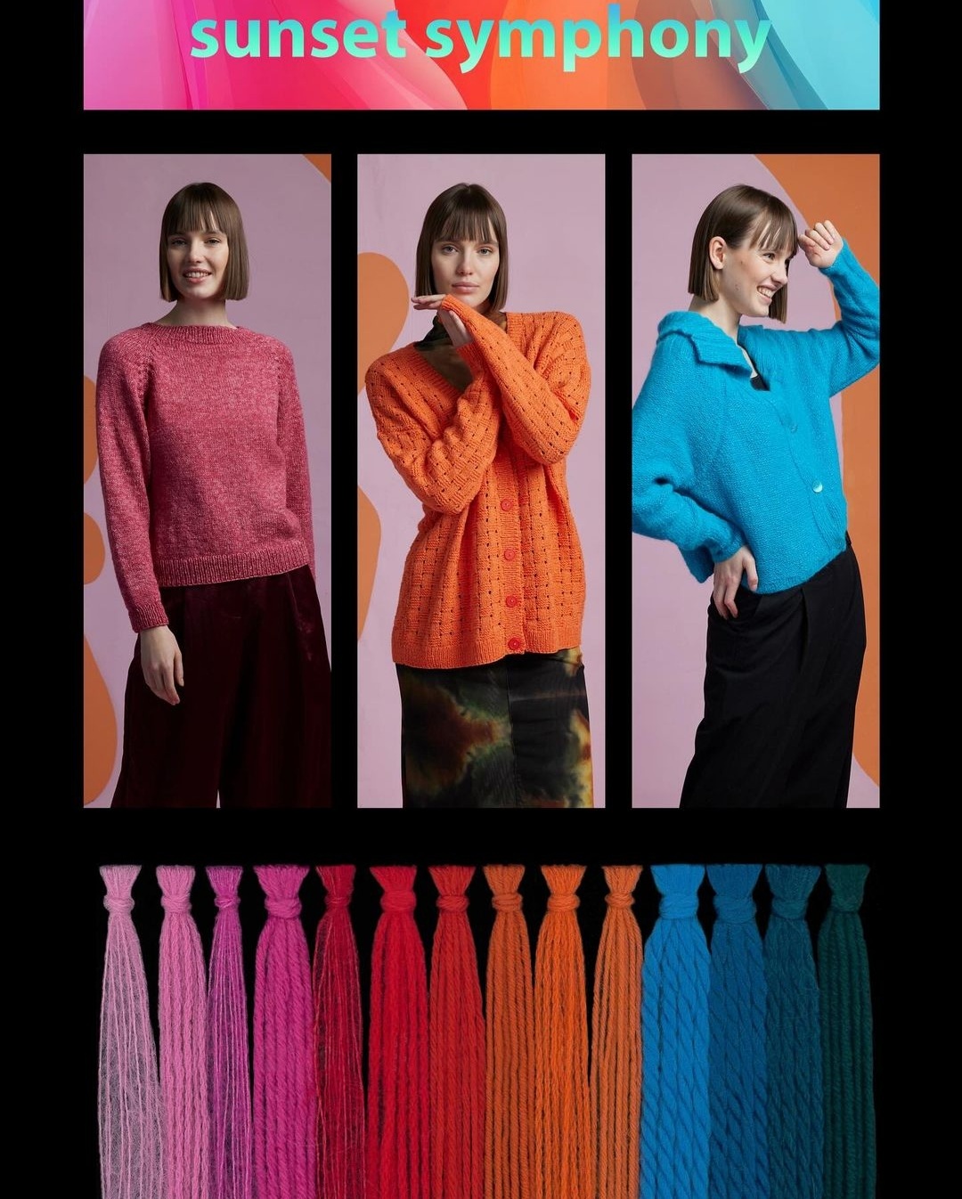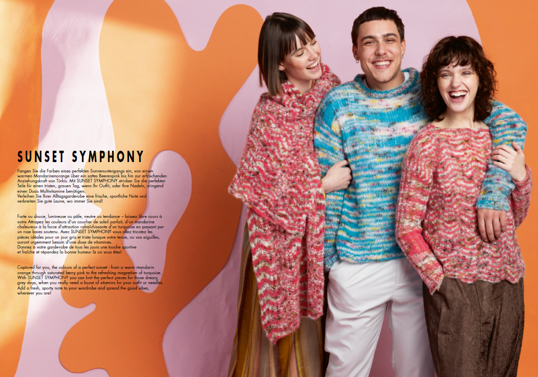 “Forte ou douce, lumineuse ou pâle, neutre ou tendance – laissez libre cours à votre imagination ! Attrapez les couleurs d’un coucher de soleil parfait, d’une mandarine chaleureuse à la force d’attraction rafraîchissante d’un turquoise en passant par un rose baies soutenu. Avec SUNSET SYMPHONY vous allez tricoter les pièces idéales pour un jour gris et triste lorsque votre tenue, ou vos aiguilles, auront urgemment besoin d’une dose de vitamines. Donnez à votre garde-robe de tous les jours une touche sportive et fraîche et répandez la bonne humeur là où vous êtes!”