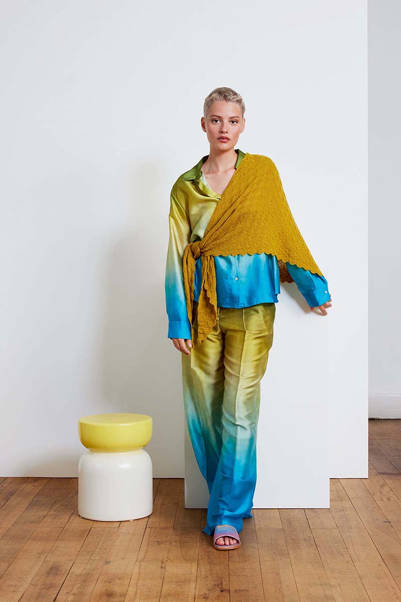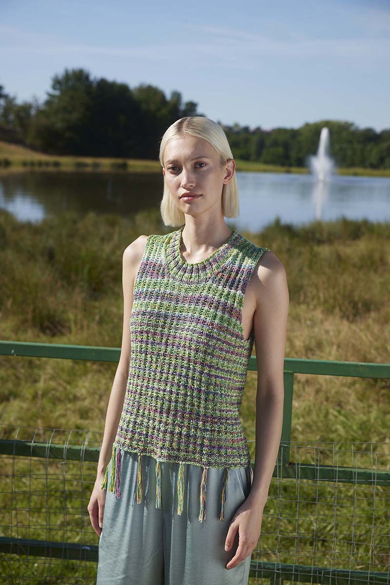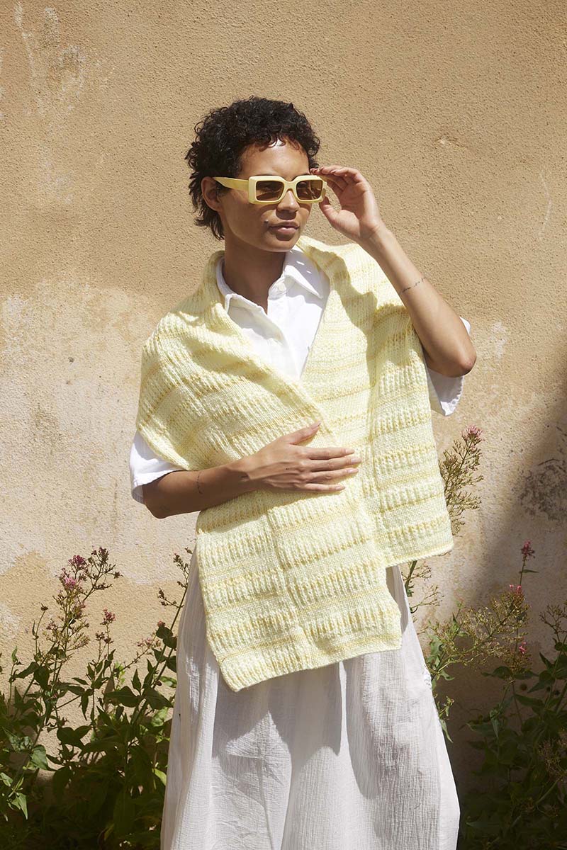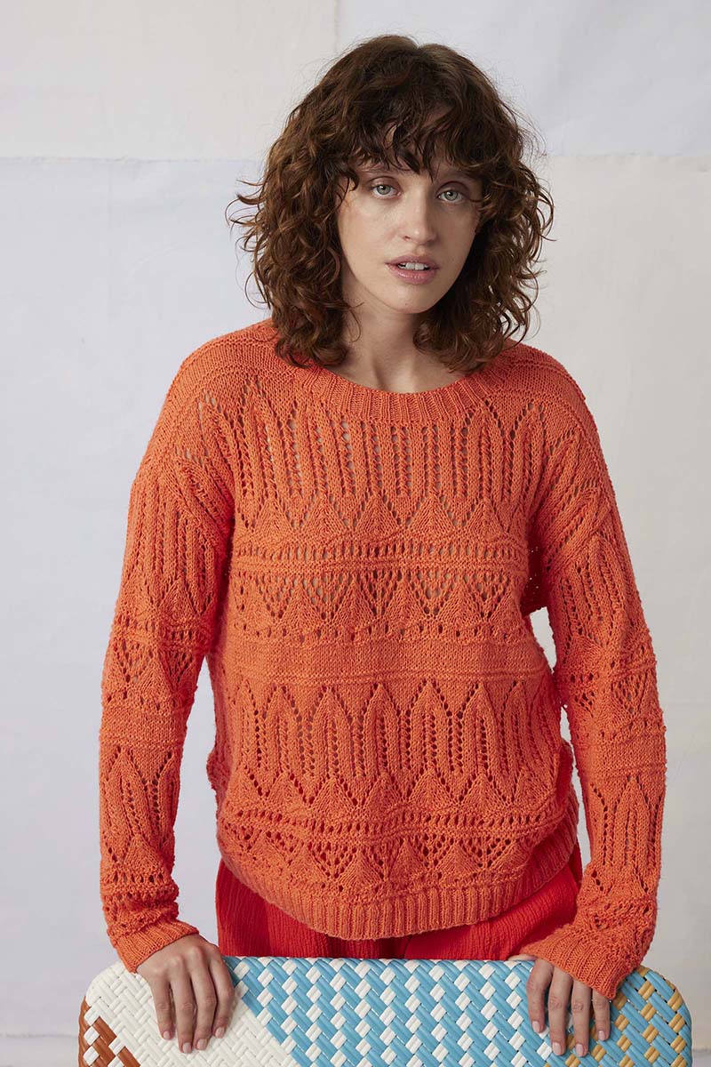 “Les points ajourés filigranes et les points dentelle dans des fils légers et aérés dominent la partie LIQUID LIGHT de notre collection. Inspirées de la lumière qui se reflète sur les eaux calmes et de l’humidité rafraîchissante d’un dimanche matin d’été, les couleurs se tiennent dans une large palette de tons bleus ainsi que de l’orange estival et du jaune tendre. Pensez à d’amples t-shirts aérés avec des motifs ajourés faciles à tricoter, des gilets structurés en superposition et des jupes et robes originales. “