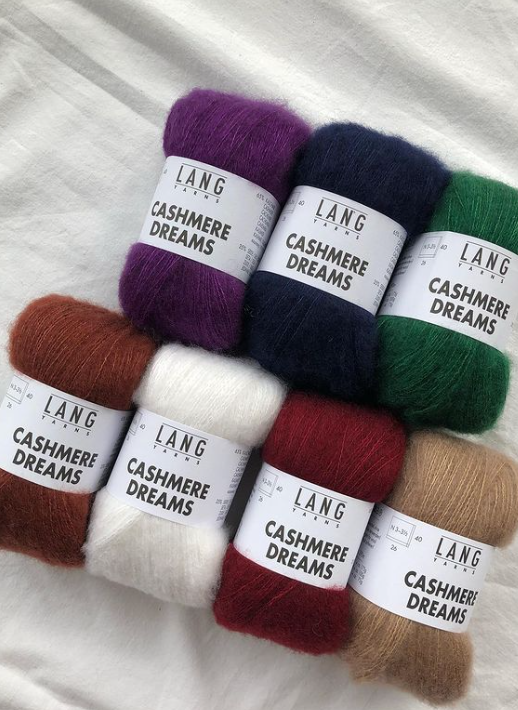 Prévoir 7 pelotes de laine Cashmere Dreams de Lang Yarns pour un pull pour homme, 4 pelotes pour femme, 3 pelotes pour un pull enfant taille 10 ans.
