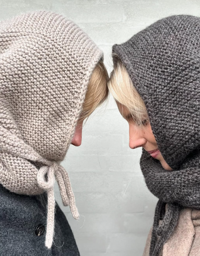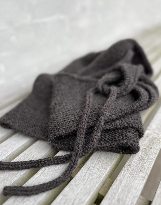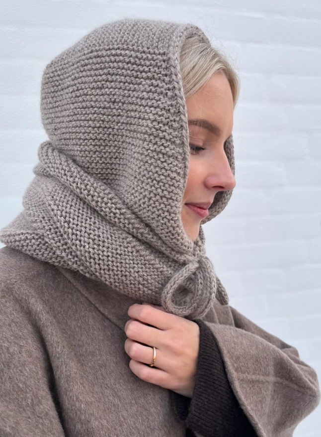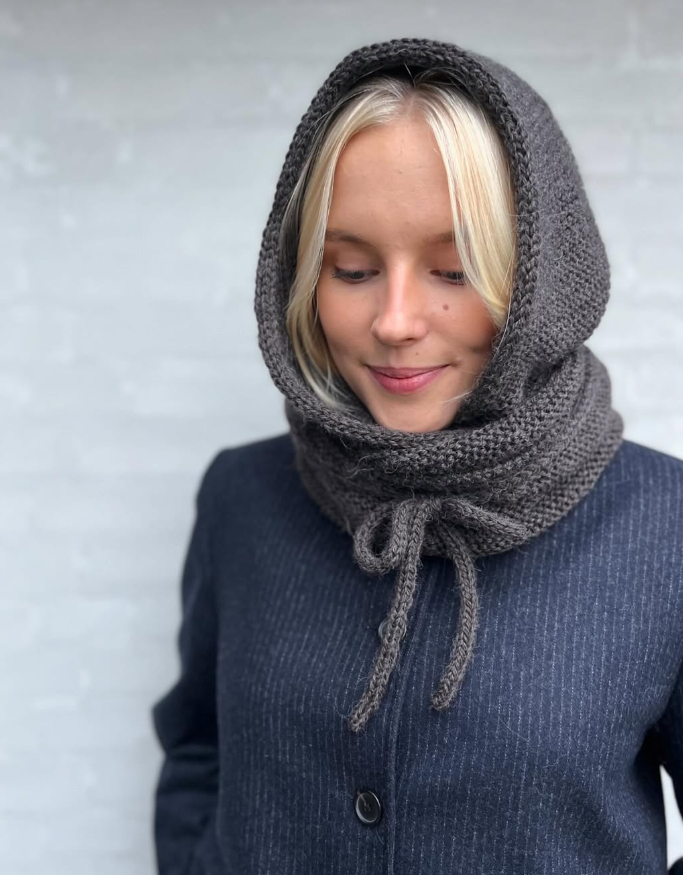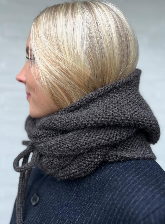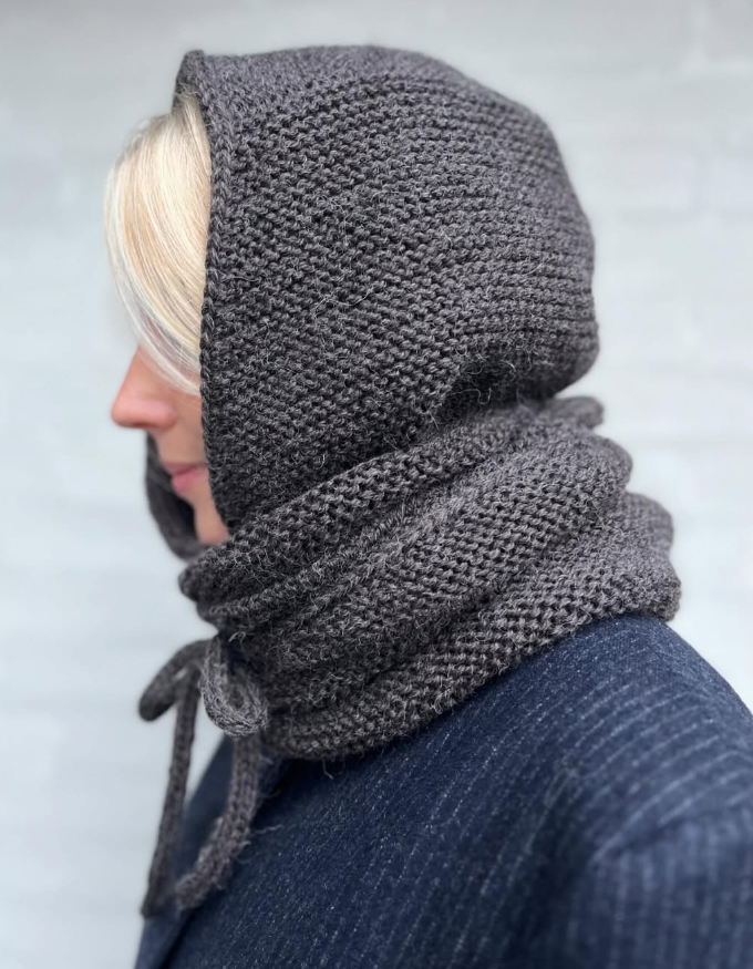 MY JOSE HOOD est une fusion entre une capuche chaude et une écharpe douce. Lorsque la capuche est abaissée, elle fonctionne comme une belle écharpe ornée d’un nœud réalisé avec des liens en I-cord. Il se tricote de haut en bas. Le haut est tricoté en premier, puis des mailles sont relevées le long des bords. La capuche est travaillée en aller-retour. Les augmentations sur les bords avant transforment progressivement la forme de la capuche en écharpe. Des I-cords terminent chaque bord et forment les liens à chaque extrémité.