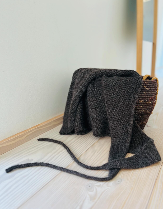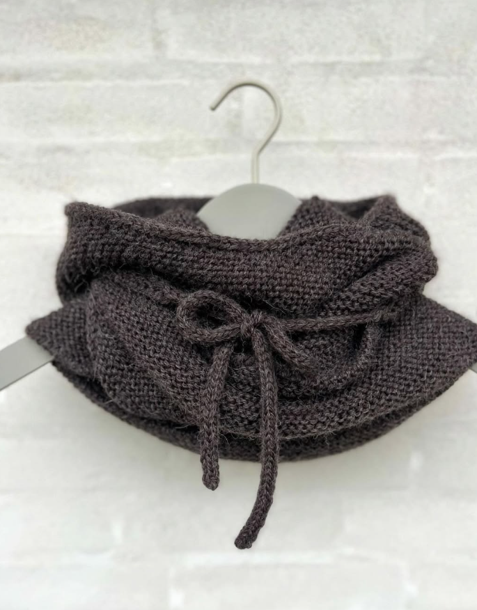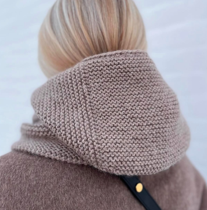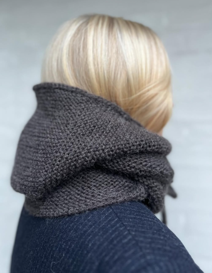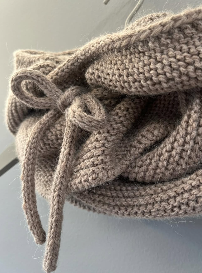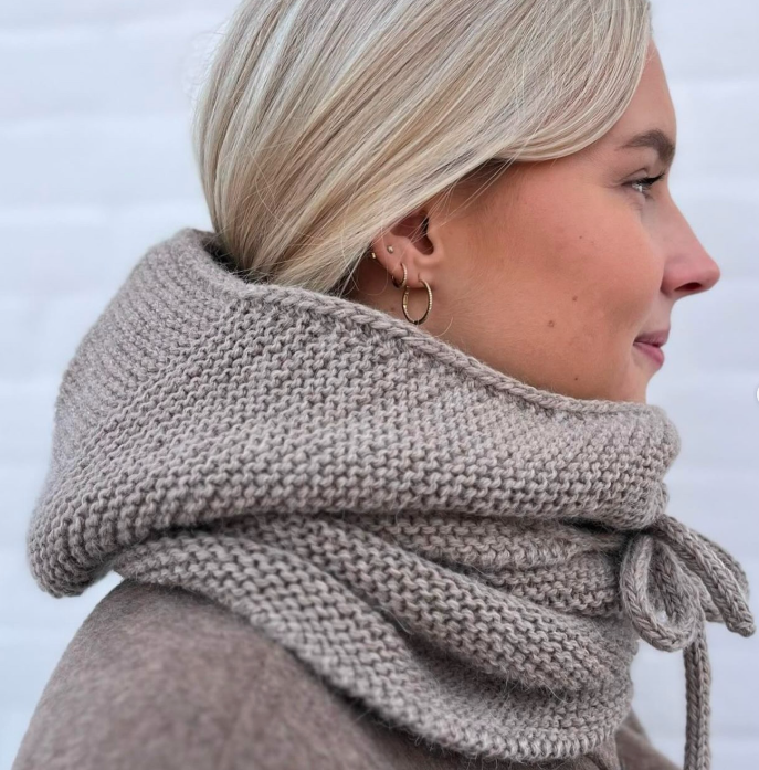 MY JOSE HOOD est une fusion entre une capuche chaude et une écharpe douce. Lorsque la capuche est abaissée, elle fonctionne comme une belle écharpe ornée d’un nœud réalisé avec des liens en I-cord. Il se tricote de haut en bas. Le haut est tricoté en premier, puis des mailles sont relevées le long des bords. La capuche est travaillée en aller-retour. Les augmentations sur les bords avant transforment progressivement la forme de la capuche en écharpe. Des I-cords terminent chaque bord et forment les liens à chaque extrémité.