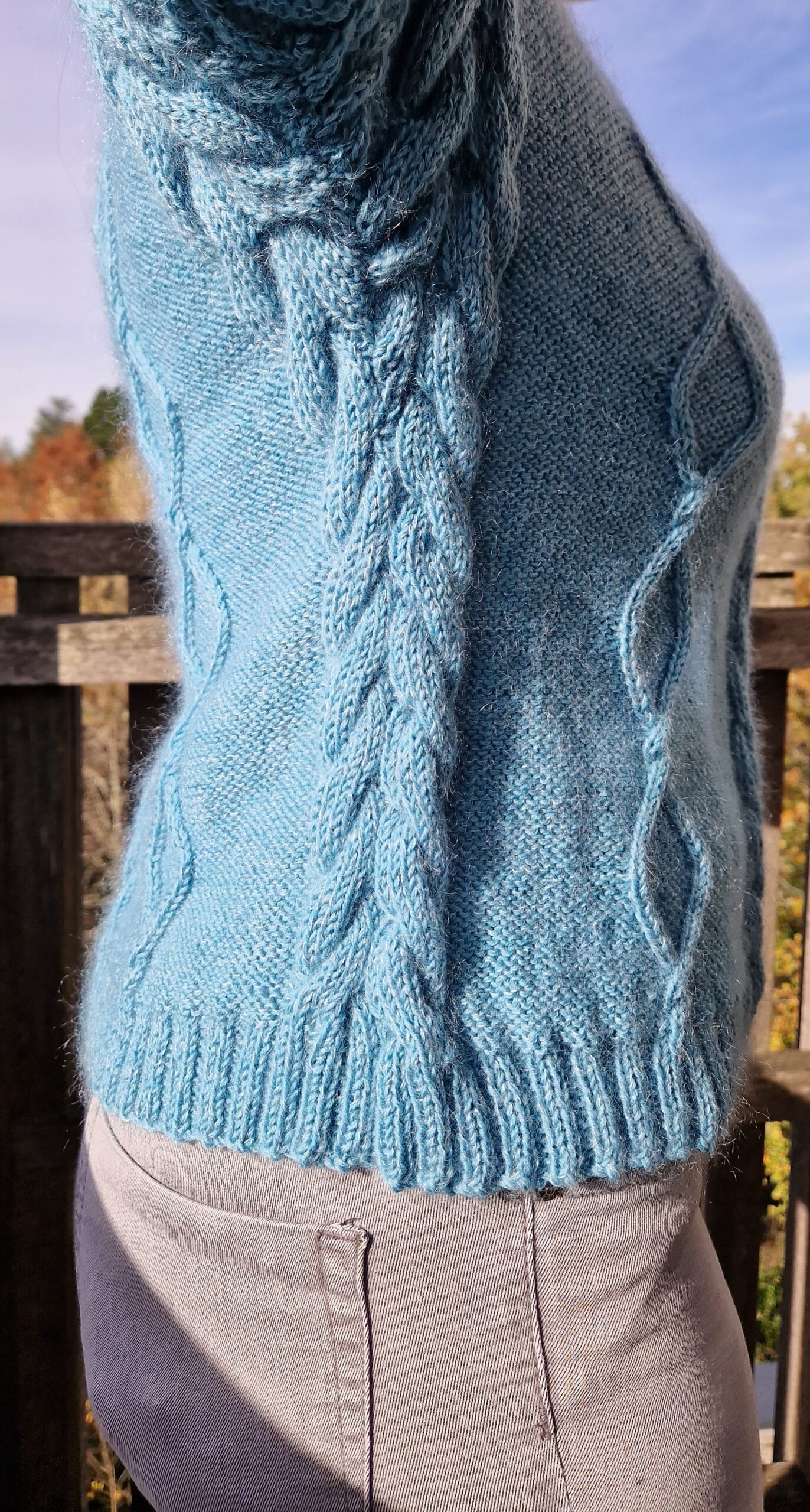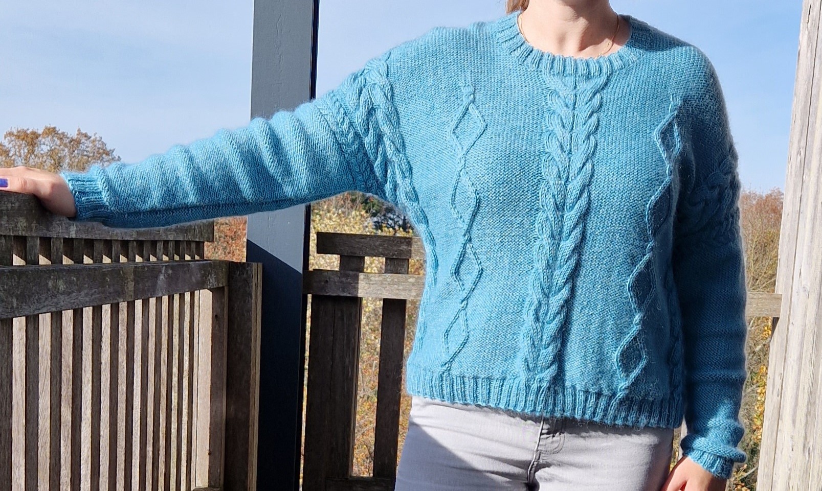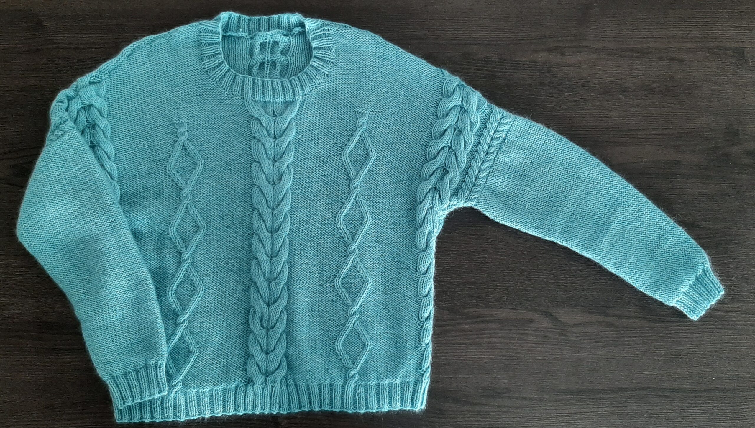 Les fournitures nécessaires pour tricoter ce pull à torsades bleu turquoise