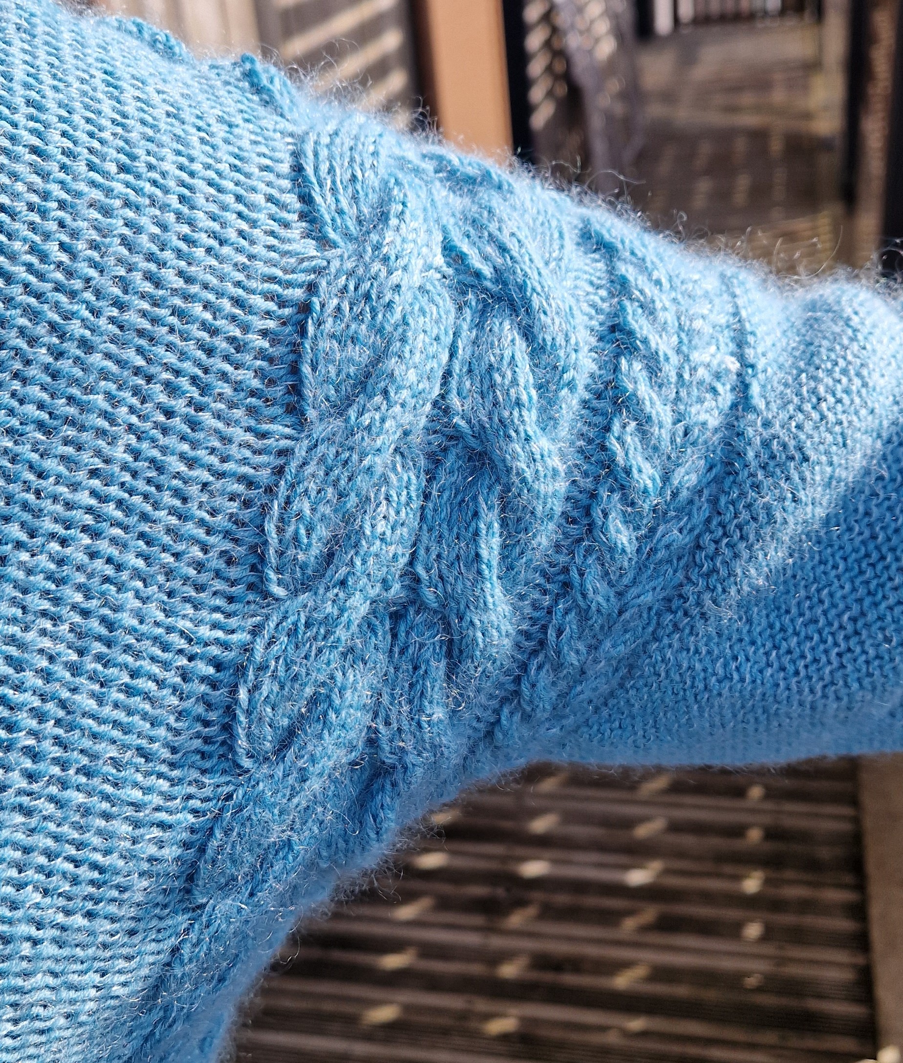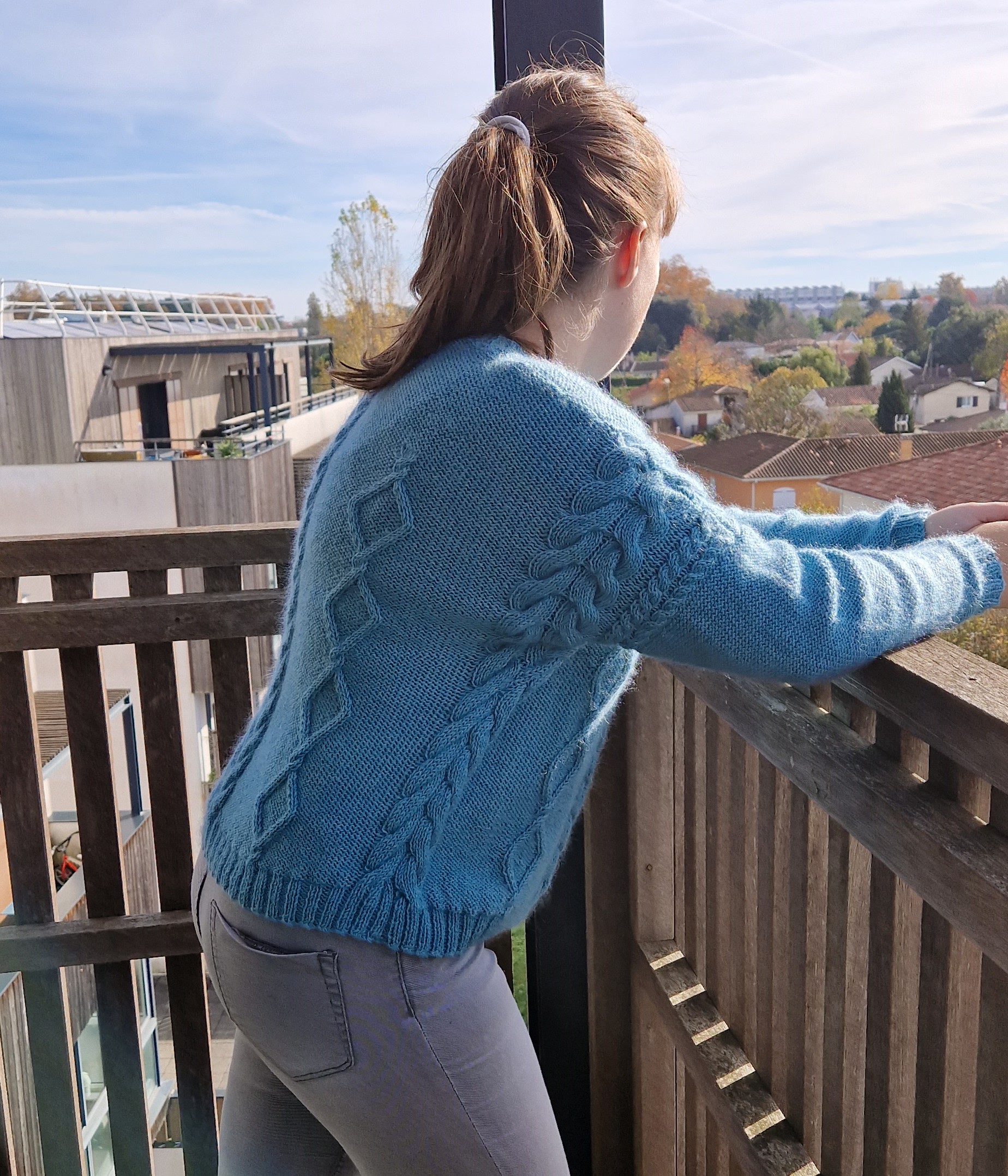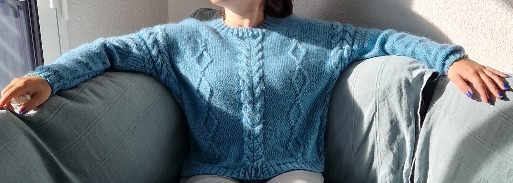 Pourquoi ne pas avoir respecter la laine du catalogue pour ce modèle ? Tout simplement car la Merino 70 est un fil assez épais, j’avais souhaité une association de merinos et mohair et soie, pour un rendu plus fin et léger.
