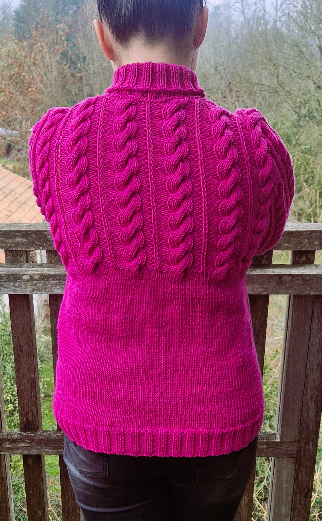 Ce modèle est issu du catalogue Lang Yarns Punto 55 Merino, modèle n°6. Il est tricoté à base de côtes 2/2, jersey endroit, torsades simples et mailles de côtes anglaises (1 maille à l’endroit en piquant 1 rang plus bas). D’une hauteur de 68 cm pour toutes les tailles, il mesure en largeur (46/50/54/59) cm de tour de taille. Le point de torsades et de mailles anglaises ne se retrouvent que dans le haut du dos et du devant et sur les manches.