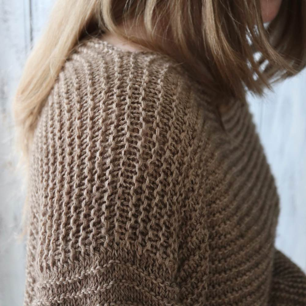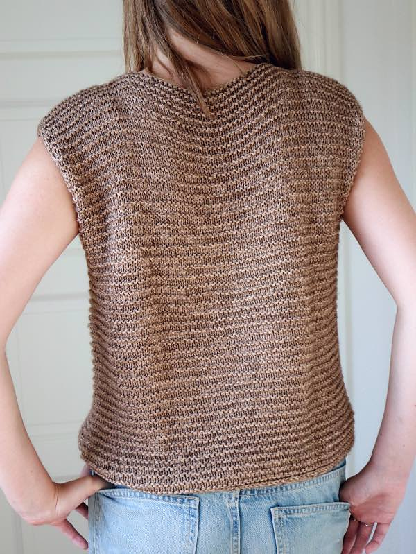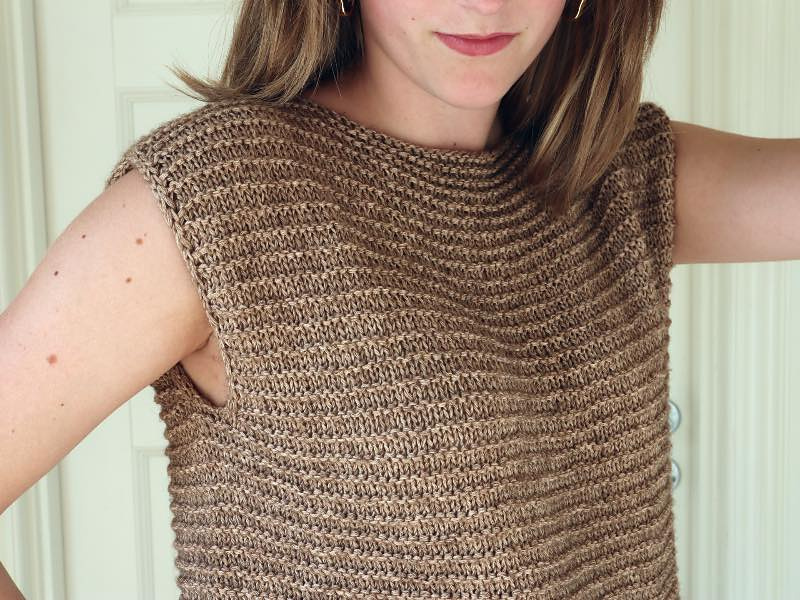 Comme la largeur des épaules dépend de la taille choisie et donc de la largeur du haut, les épaules s’étendent davantage sur les bras dans les grandes tailles que dans les petites. Cette construction donne l’impression que le top a une petite manche, qui est néanmoins maintenue près du bras grâce à une bordure i-cord tricotée en même temps.
