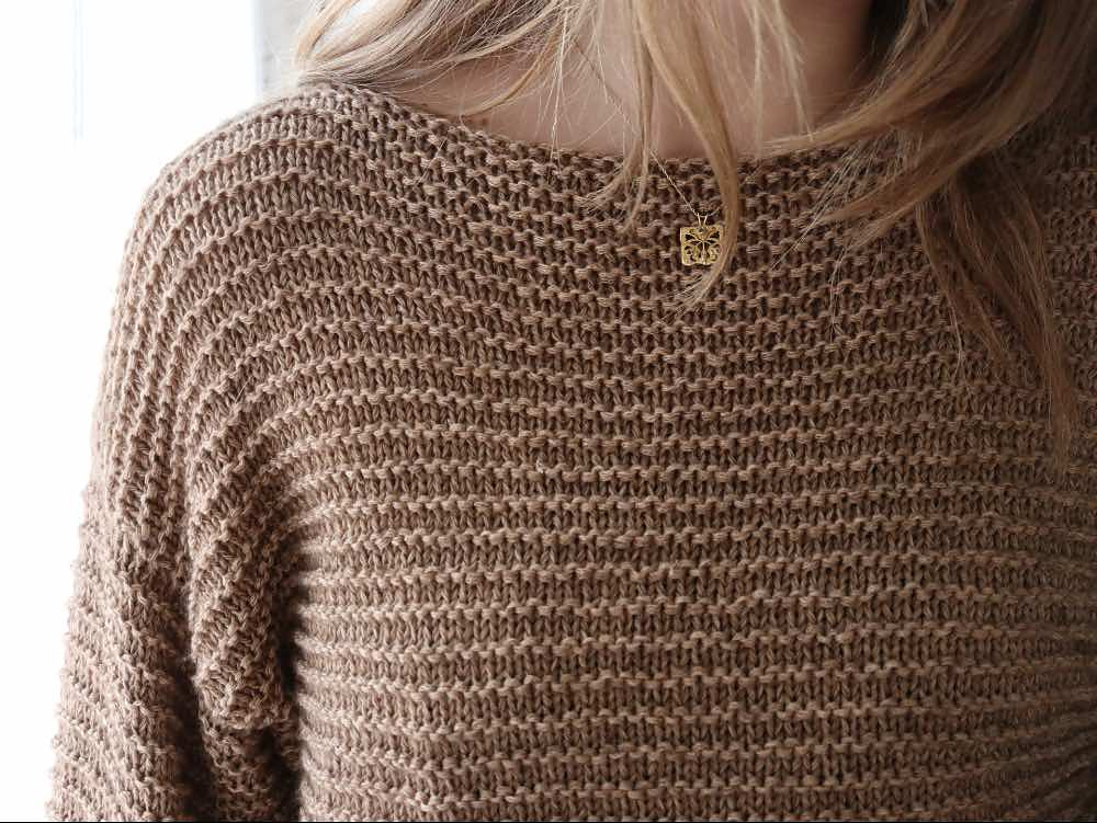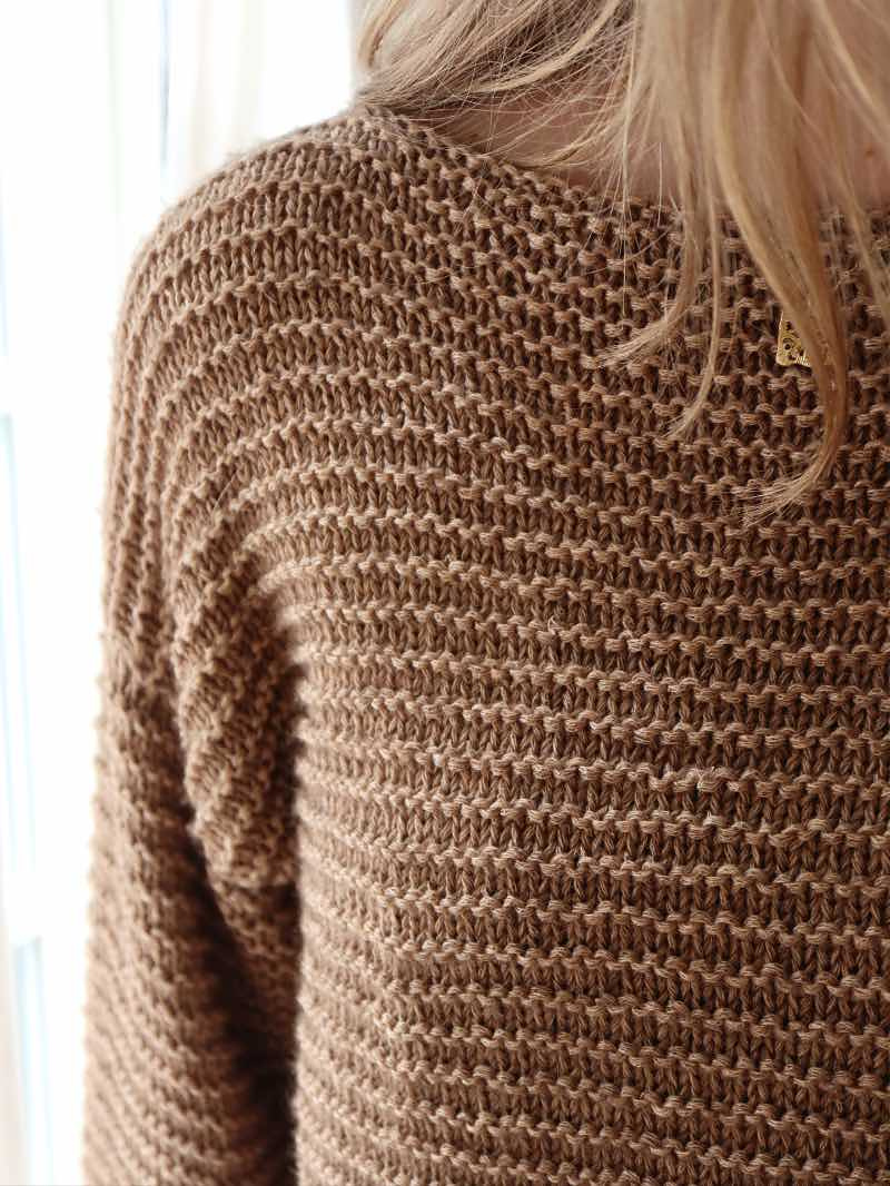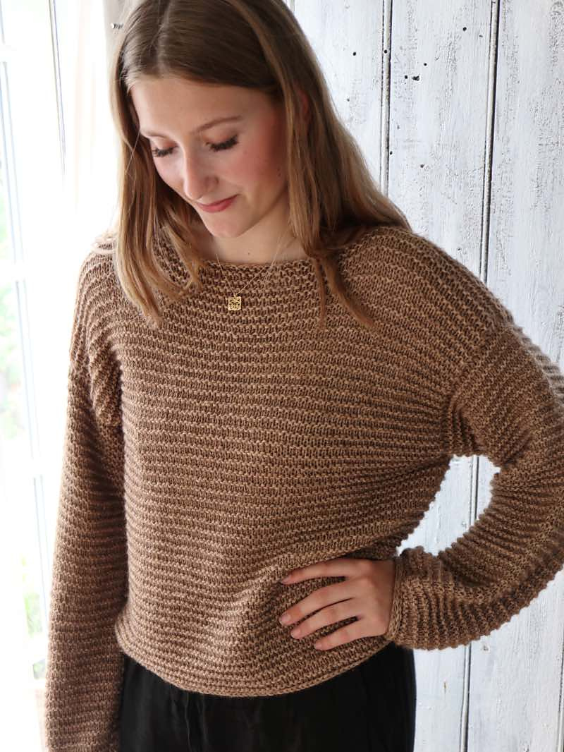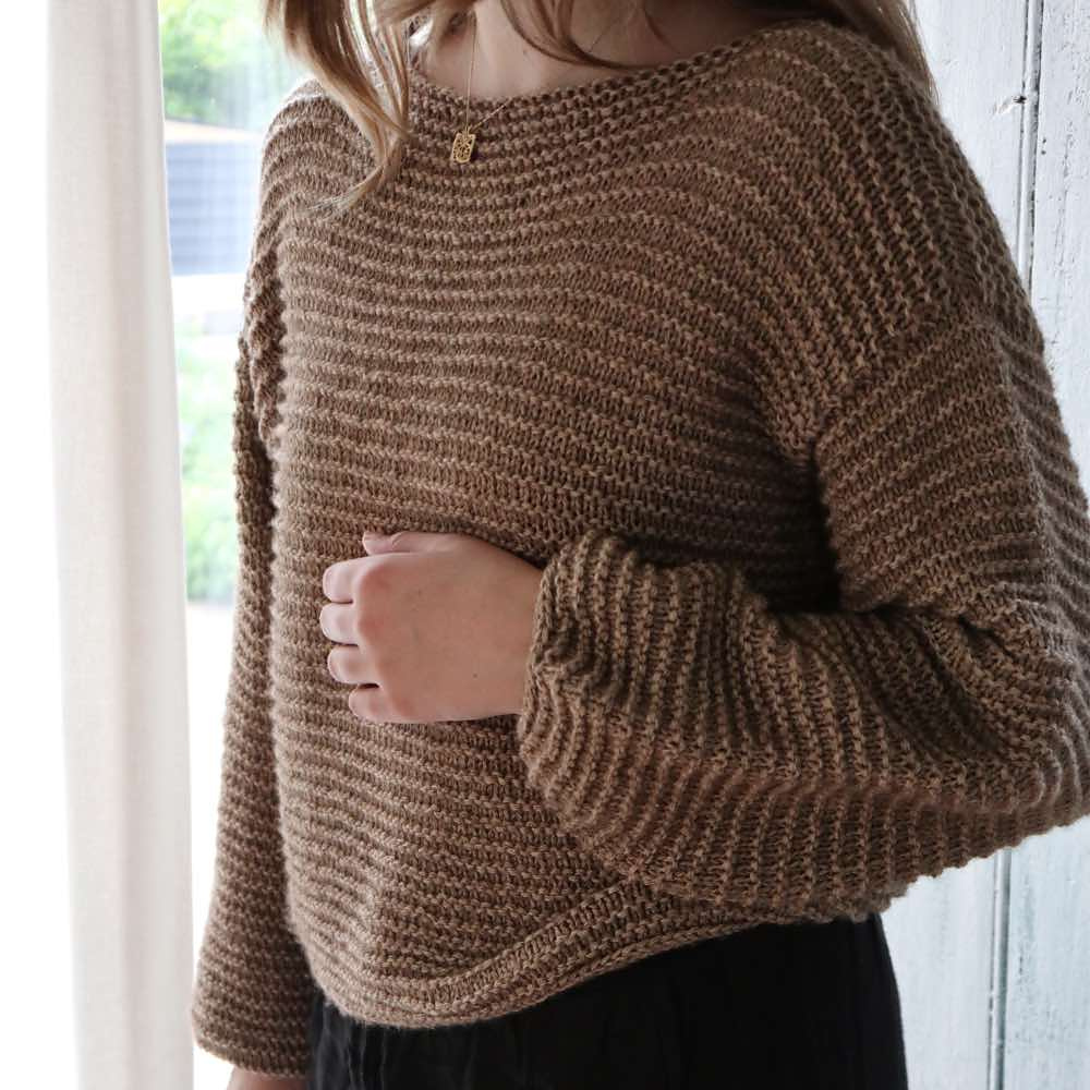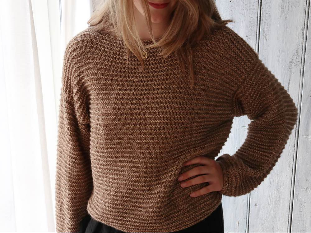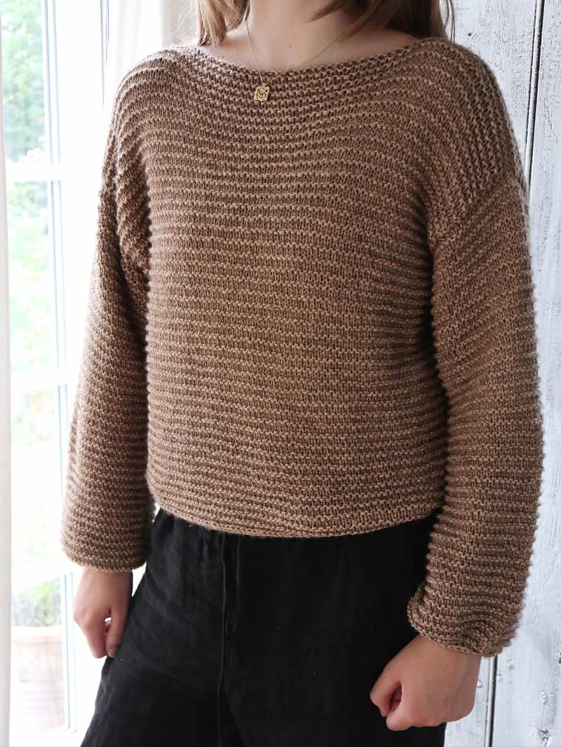 #meadowtop est un top tricoté simple en point mousse avec un joli col bateau et une légère ampleur. Le style est épuré et moderne.