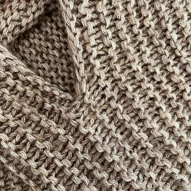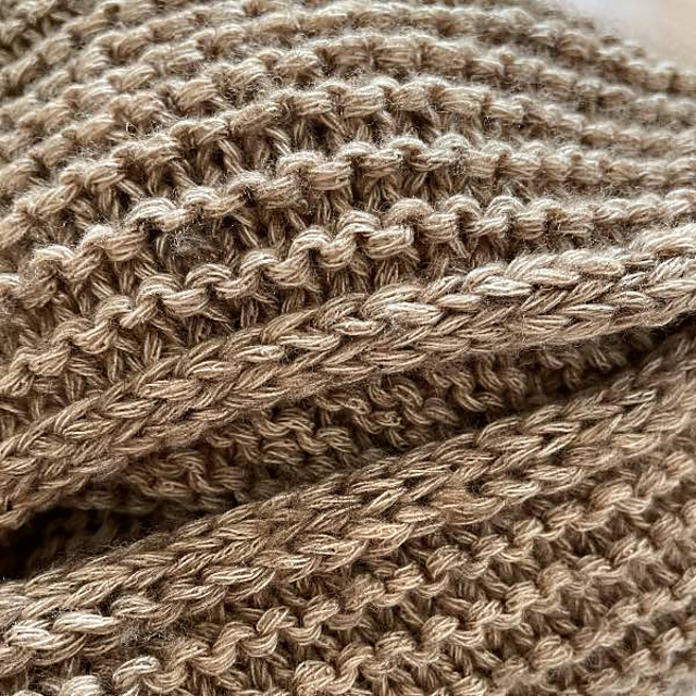 Échantillon : 16 mailles x 28 rangs en point mousse (2 rangs en jersey endroit et 1 rang envers) avec des aiguilles 6,0 mm = 10 x 10 cm, en fil double.