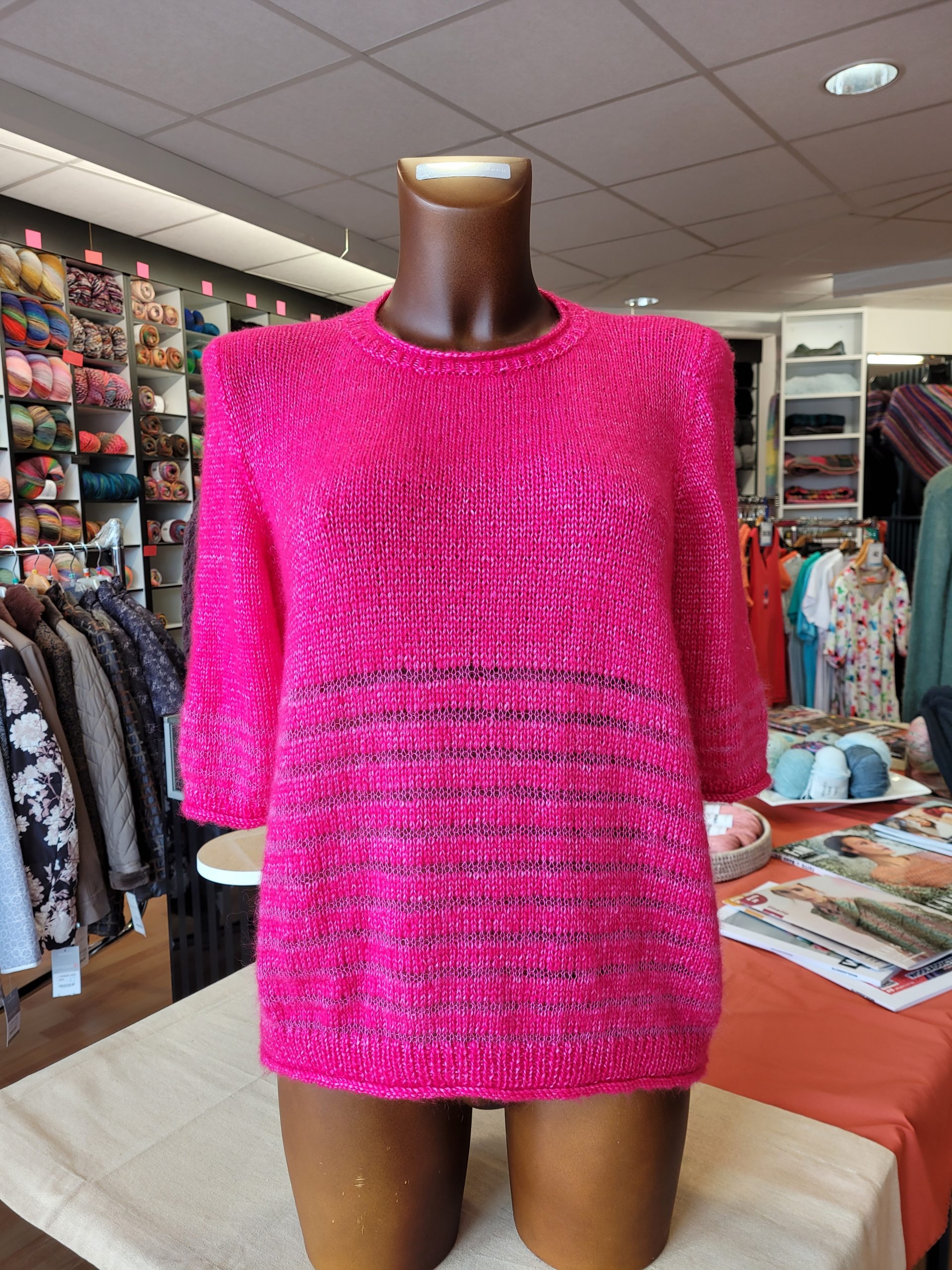 Pour ce pull , j’ai voulu faire quelques lignes (2 rangs) de Lace de façon ajourée, pour donner un visuel encore plus léger. J’ai choisi des manches courtes et montées à la carrure pour une allure plus raffinée.