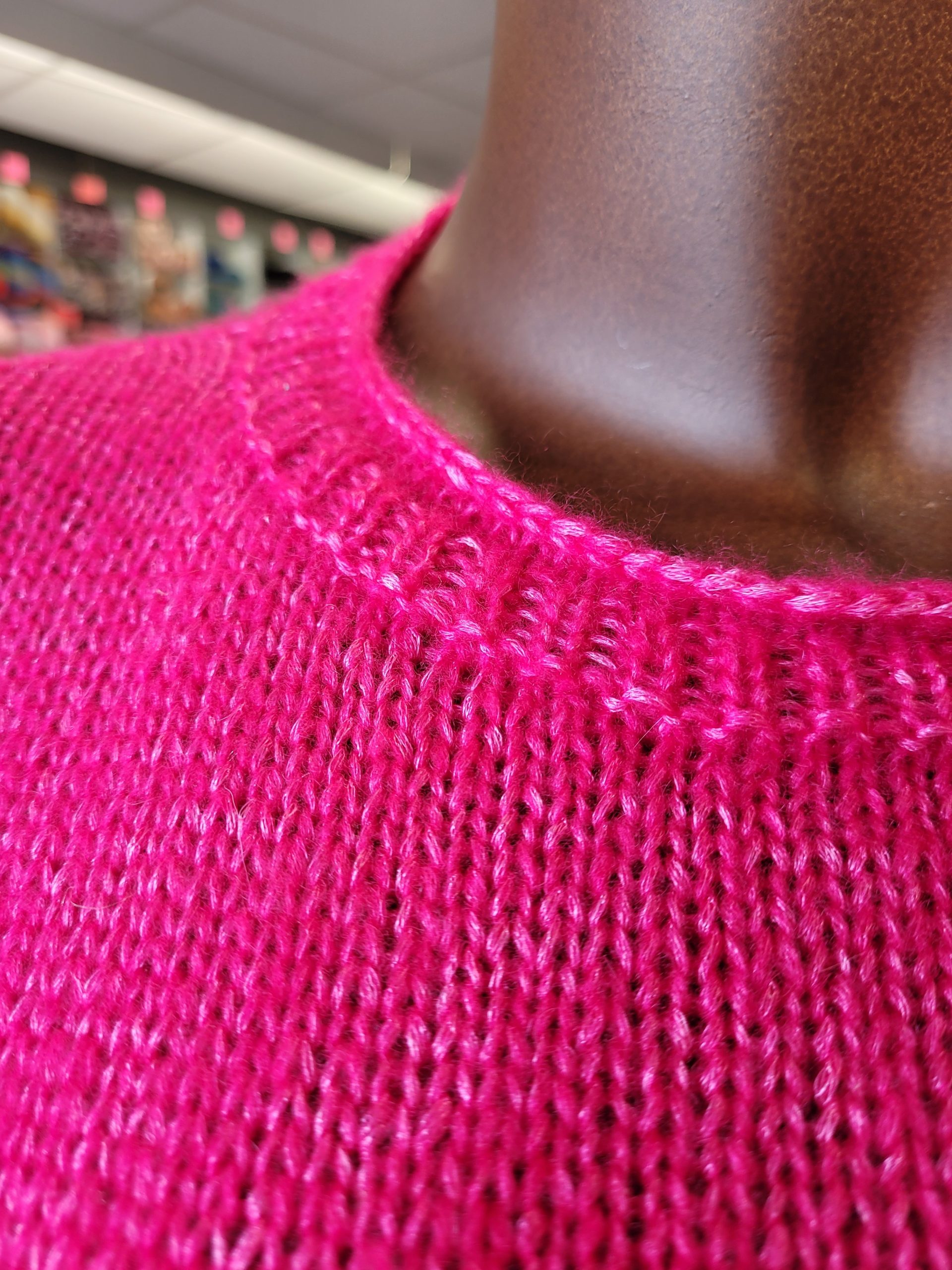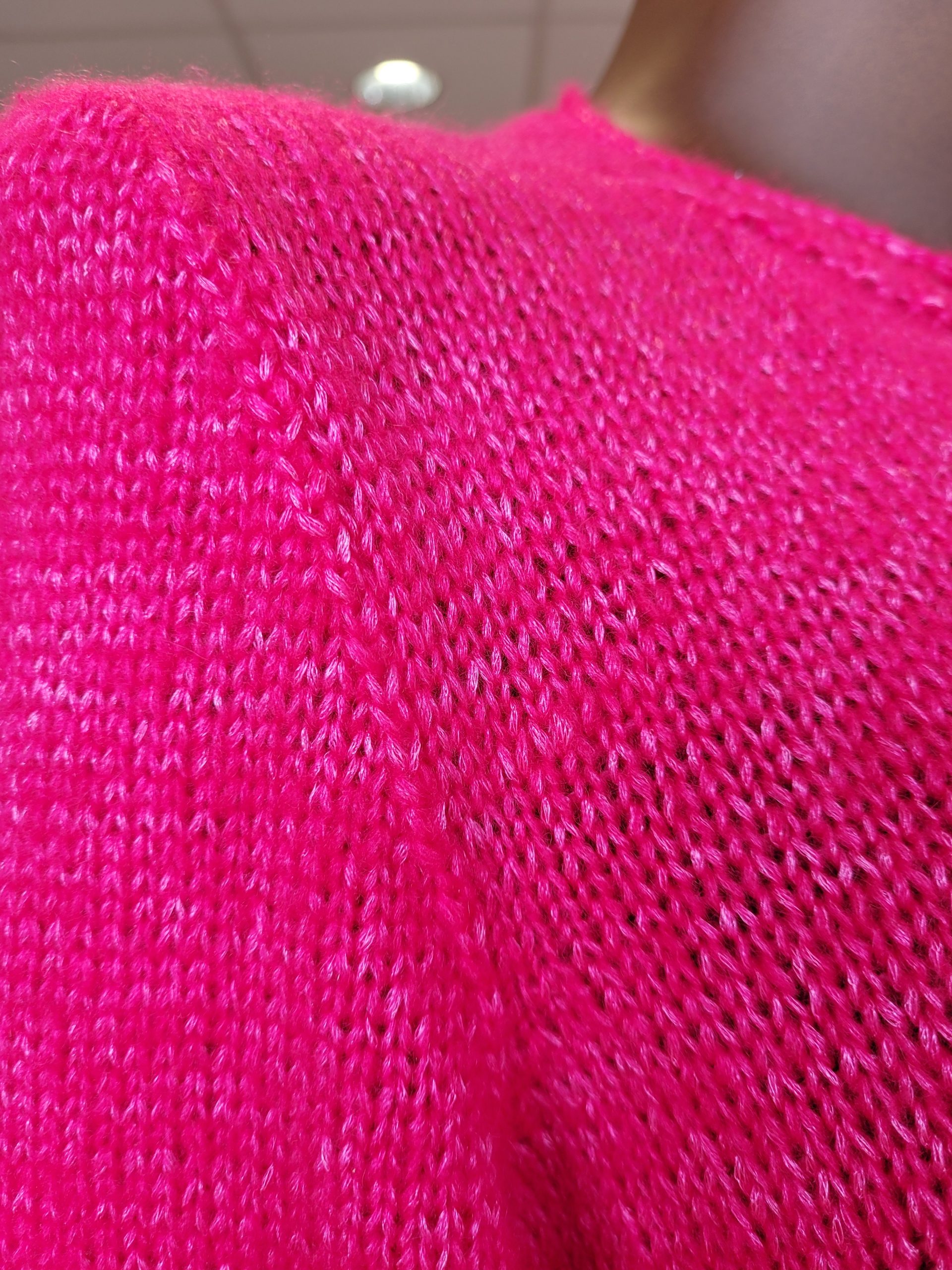 La composition des matières de ce pull, cachemire, soie et mohair ont fait de cet ouvrage un bonheur à tricoter, à la fois soyeux et d’une douceur incomparable.