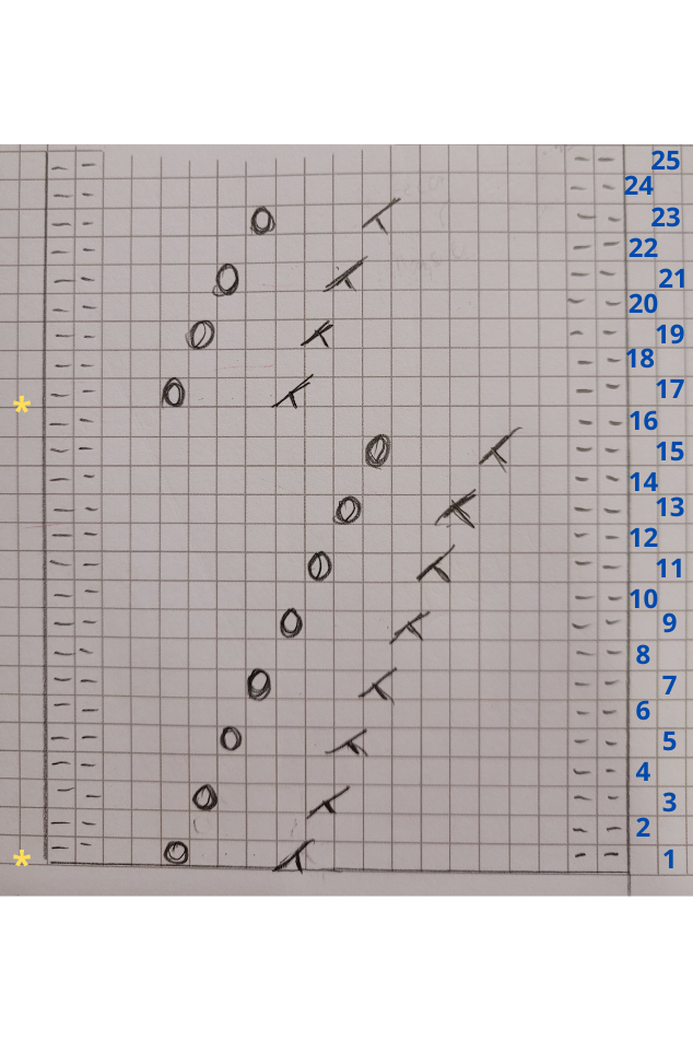 Sur la grille, vous trouverez les rangs endroits et envers. Attention, il faut répéter continuellement les rangs de 1 à 16 (* à *) afin de reproduire le motif sur la totalité de la la longueur de l’écharpe. Je reproduis donc 4 fois ce croquis pour former 4 bandes séparées par 2 mailles envers (voir photo au-dessus) sur la largeur.