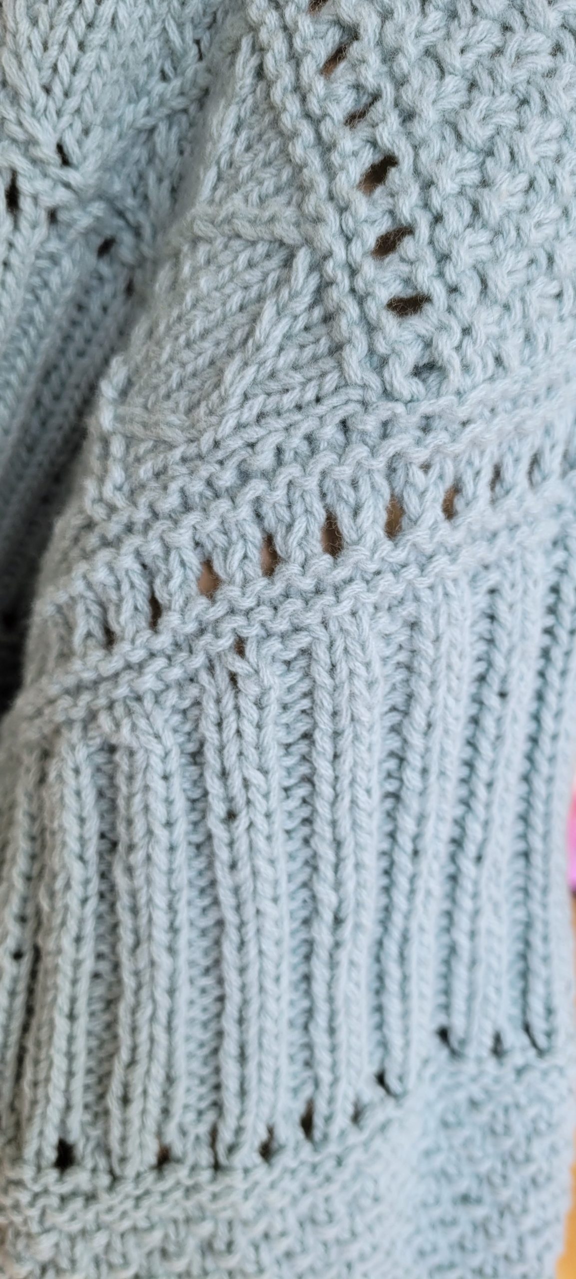 Le pull se base sur 3 sections de points (point de blé, côtes 2/2 et point de losanges) séparées par des bandes de points ajourés.