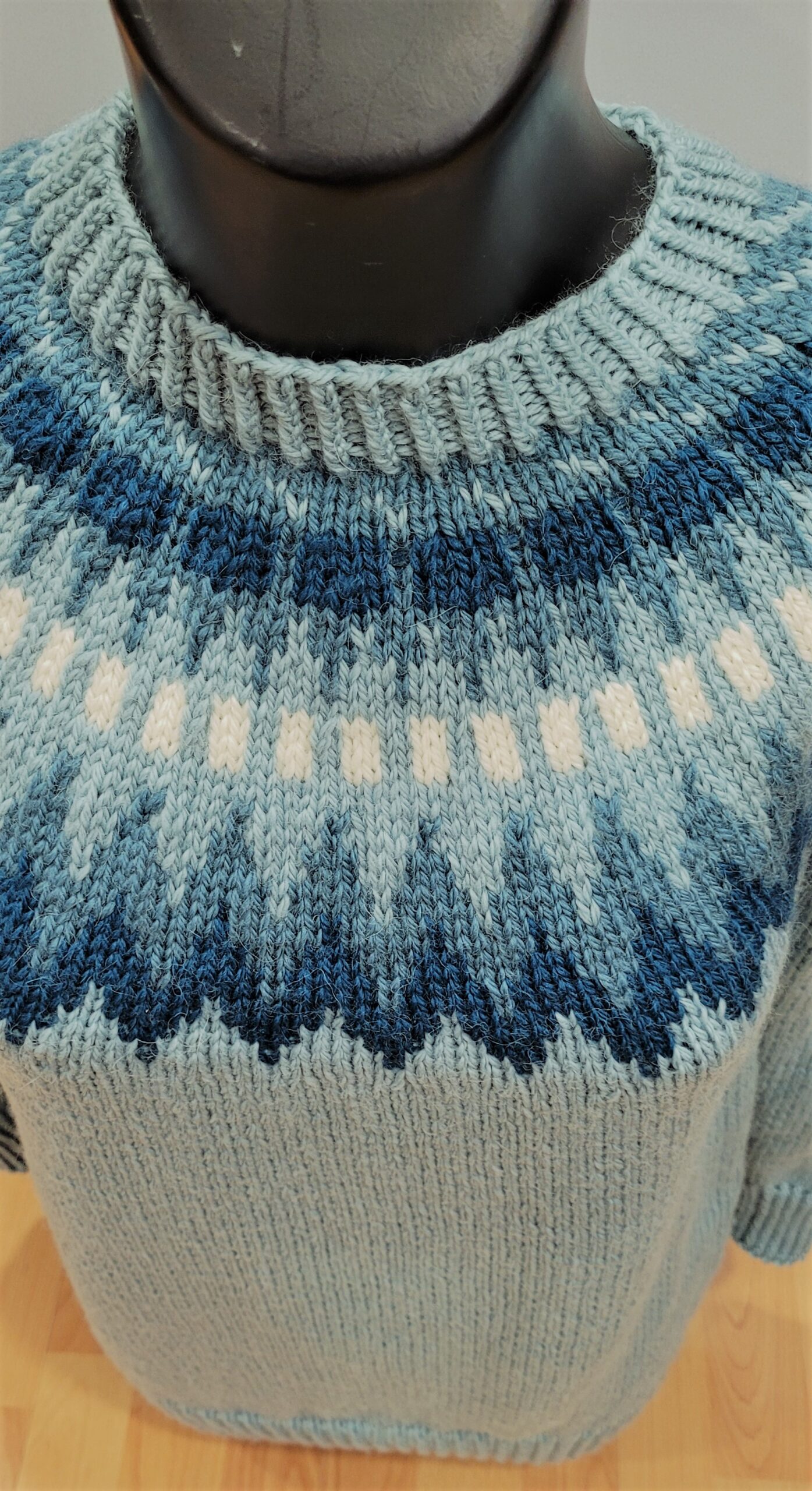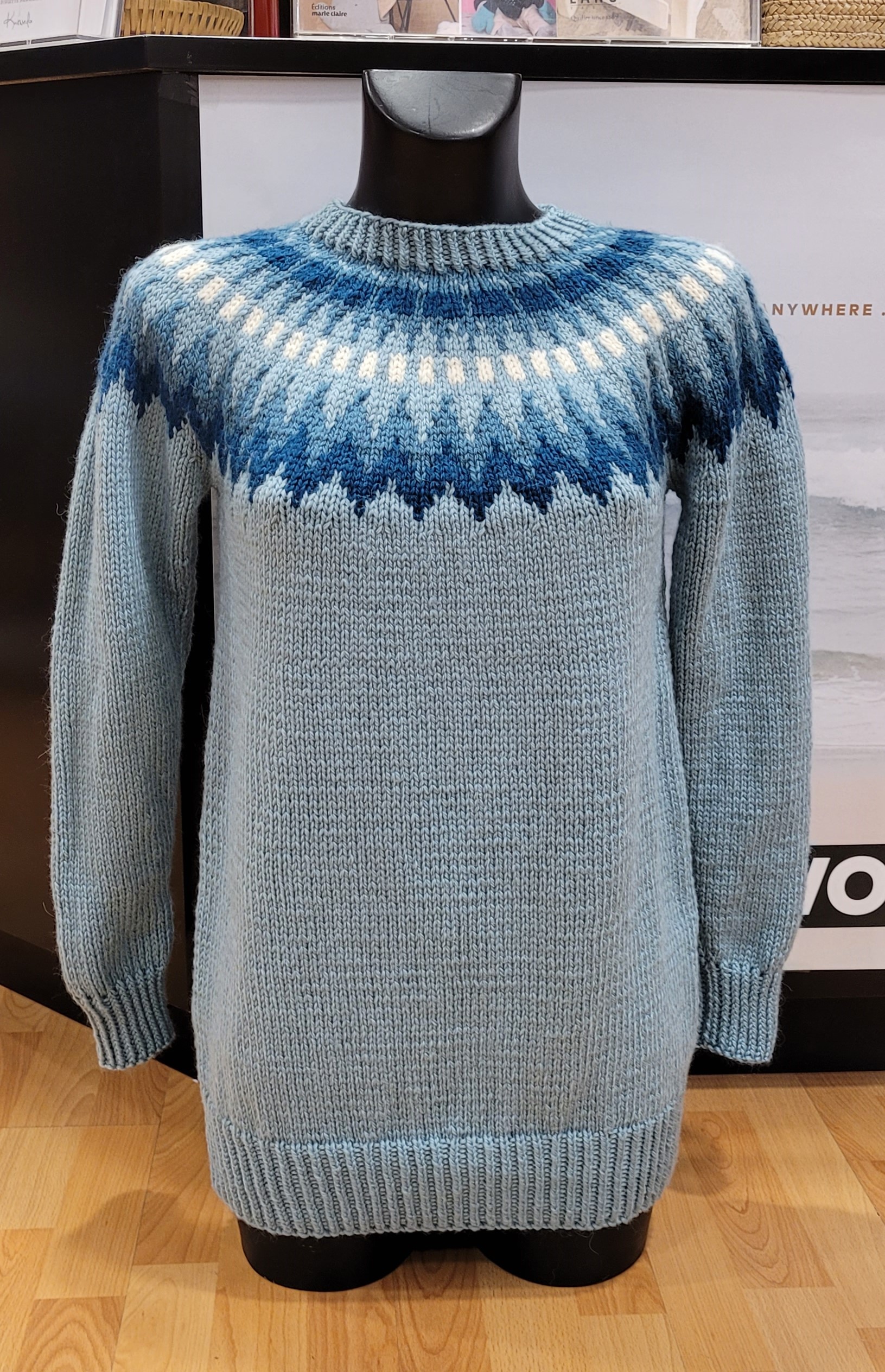 👩 Une cliente m’a demandé de lui tricoter un pull islandais, c’est vrai que cet hiver et l’hiver dernier ❄, j’ai eu beaucoup de demandes pour cette forme de pull à tricoter en rond avec jacquard, très tendance 🤩. C’est amusant de se remémorer les premiers tricots islandais que j’ai réalisés il y a plus de 20 ans 😊. Ce modèle mixte est issu du 📔 catalogue Lang Yarns Punto N°6 Jacquard, un catalogue spécial pulls jacquard de la marque Lang Yarns. On vous dit tout sur le pull islandais bleu en laine Carpe Diem de Lang Yarns. 🧶