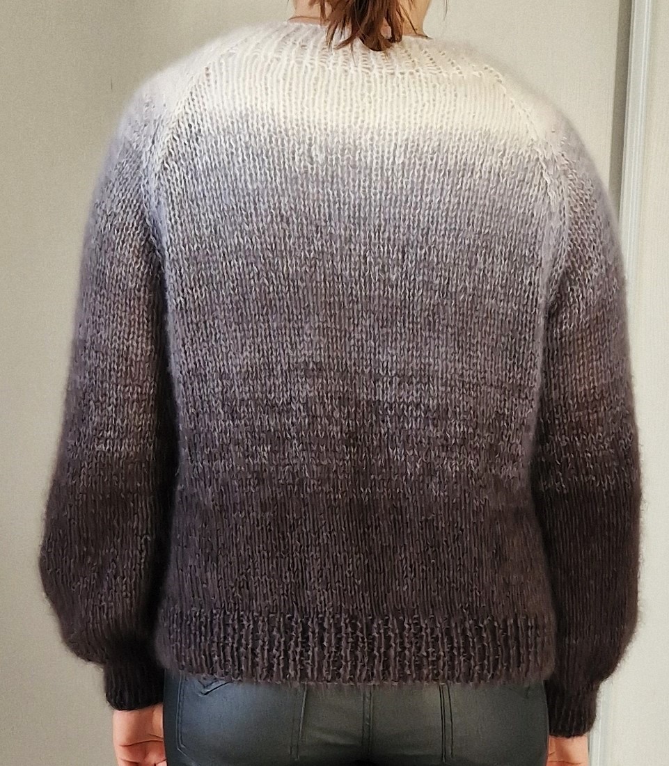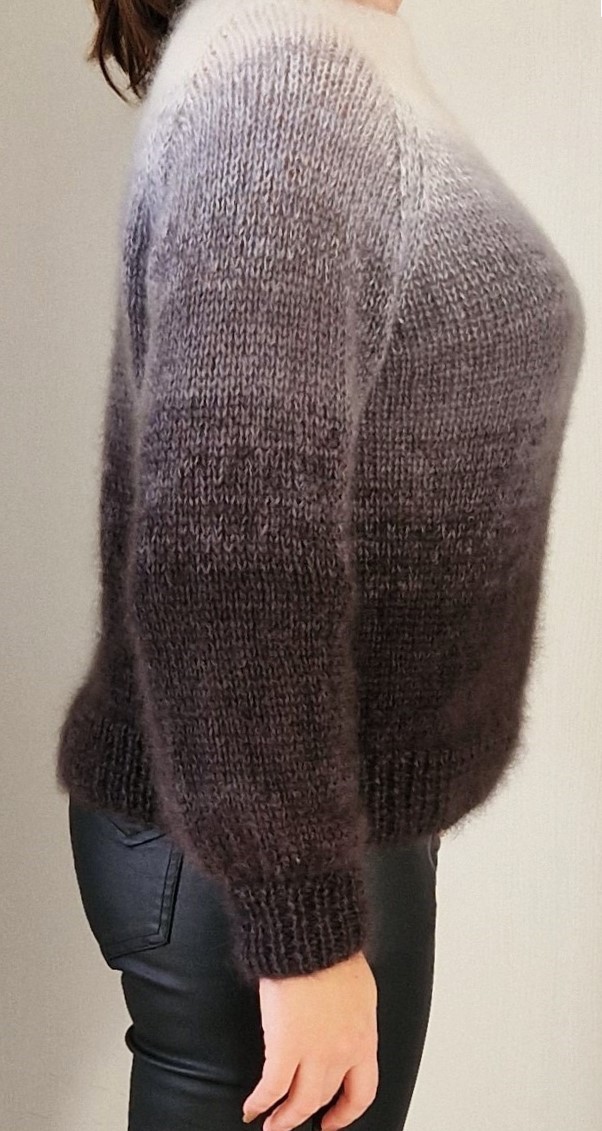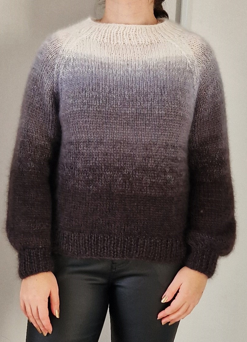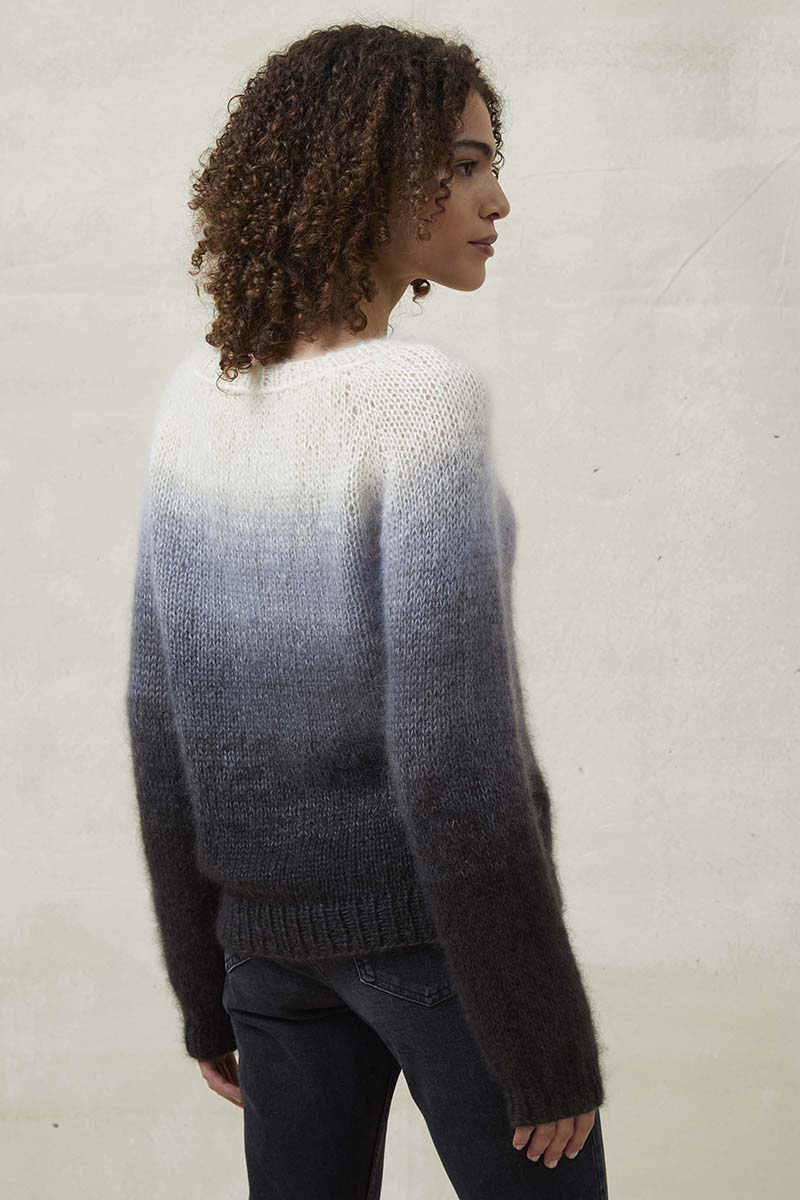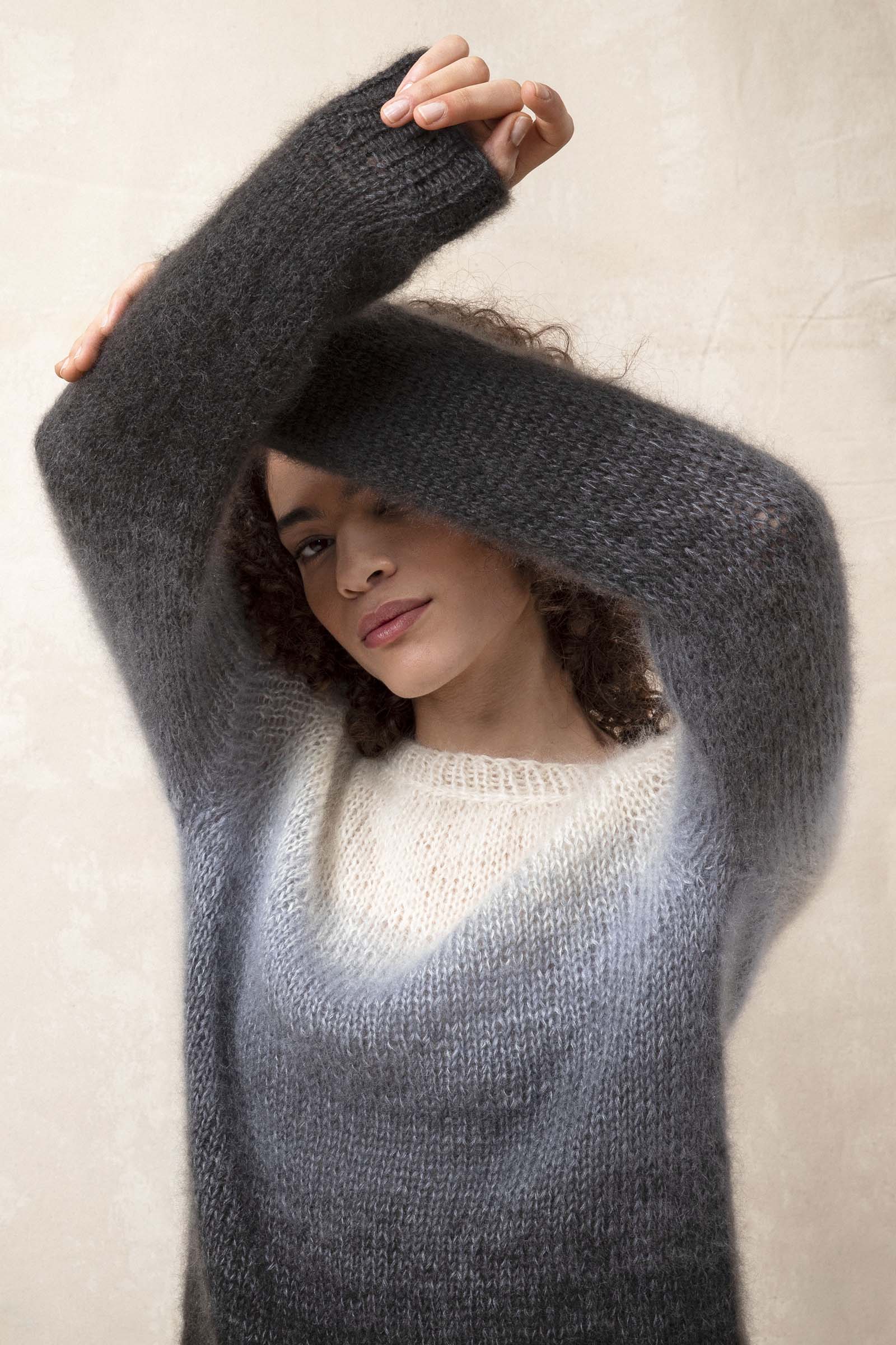 Issu du catalogue Lang Yarns Punto 48 Top Down, modèle n°1, collection automne-hiver 2021-2022, il est tricoté en 5 fils ensemble de mohair et soie Lace de Lang Yarns. Les points sont simples car il s’agit uniquement de jersey endroit et de côtes 1/1. La technique du dégradé de couleurs se réalise en commençant par 5 fils ensemble du coloris anthracite 0070 puis tous les X rangs, il faut se séparer d’un brin anthracite pour en prendre 1 autre brin de la couleur suivante se situant au-dessus de l’anthracite, soit le colori gris moyen 0005. Il faut toujours qu’il y ait 5 fils tricotés ensemble. Et cela ainsi de suite. Certains morceaux de X rangs sont uniquement tricotés avec une seule et même couleur.