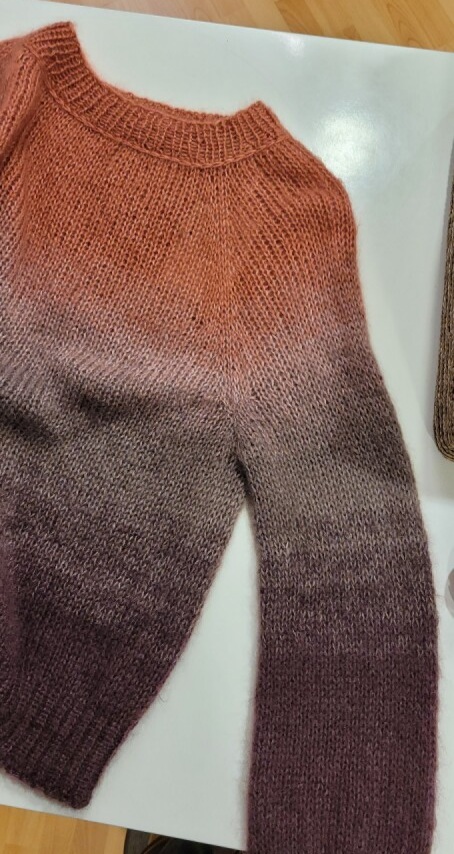 Ci-dessous, deux images d’autres coloris utilisés pour ce pull dégradé en laine Lace, tricotés en top down :