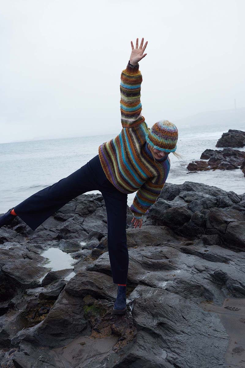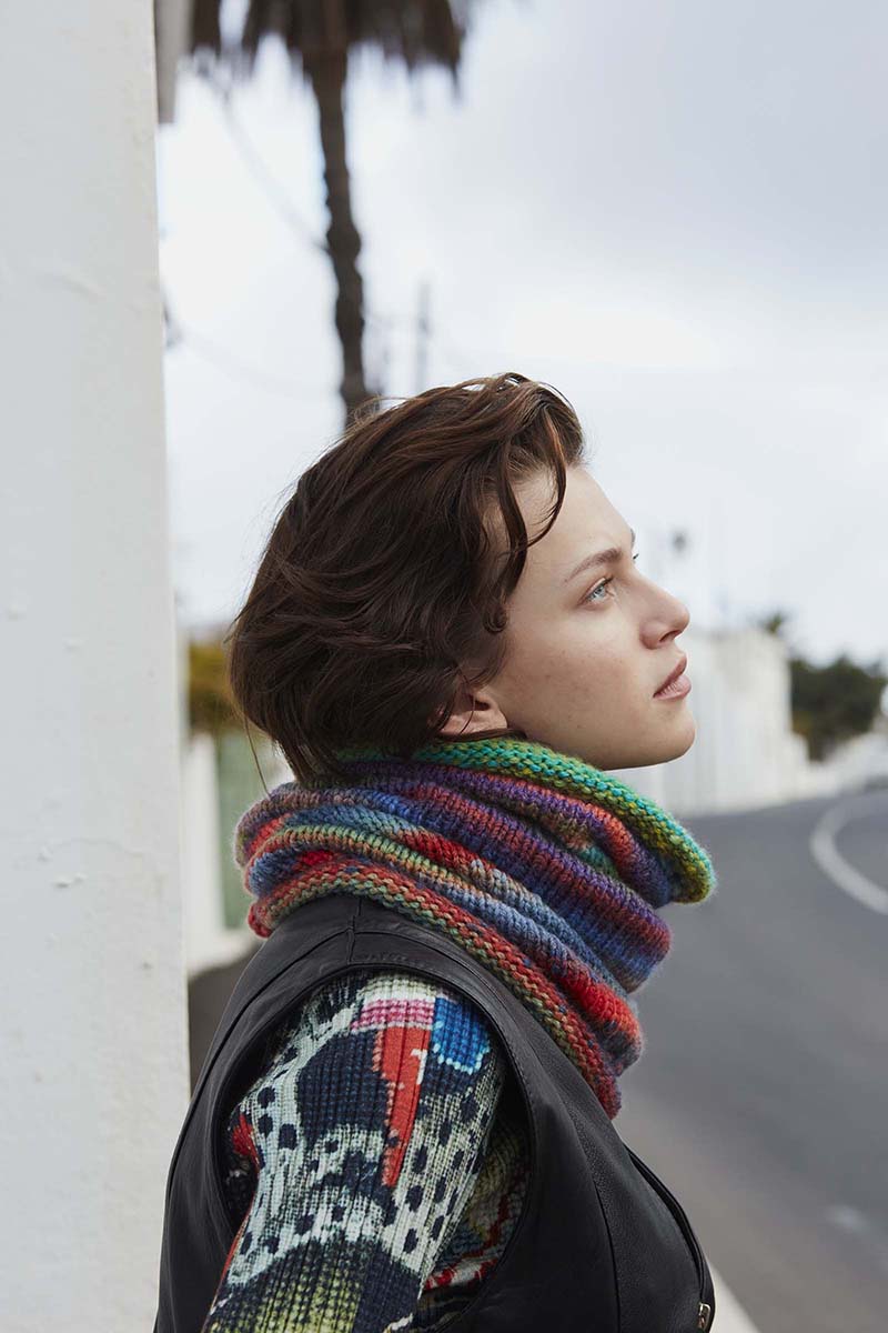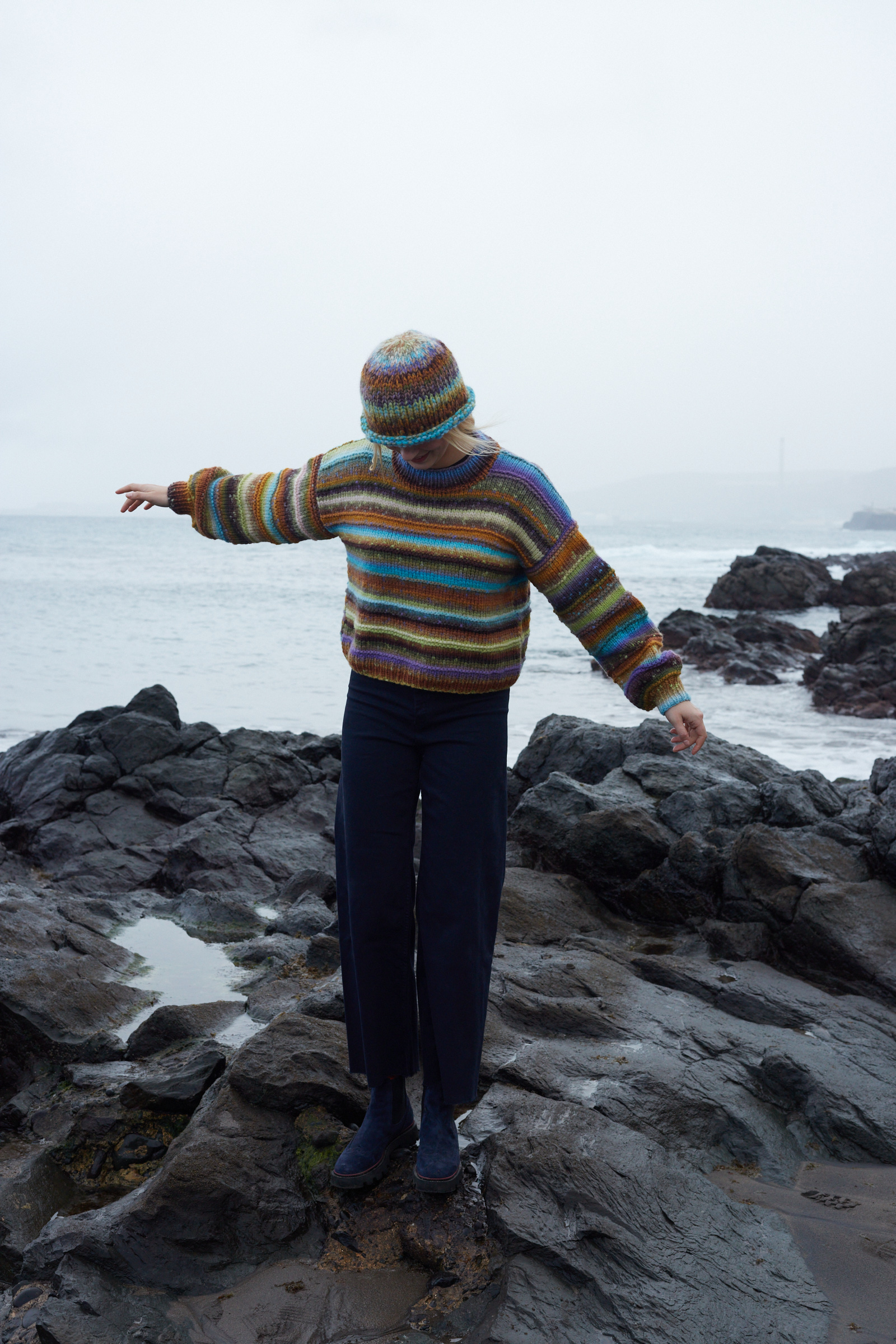 D’ailleurs, il existe même un chapeau tricoté pour aller avec ce pull, n°38 du catalogue Wooladdicts 11. En taille unique, vous aurez besoin de 2 pelotes supplémentaires du coloris 1125.0005 de laine Mystery et d’un jeu d’aiguilles n°12. Il est tricoté en fil double, entièrement en jersey endroit.