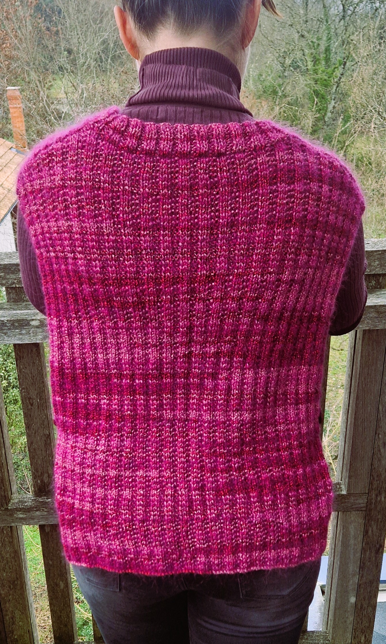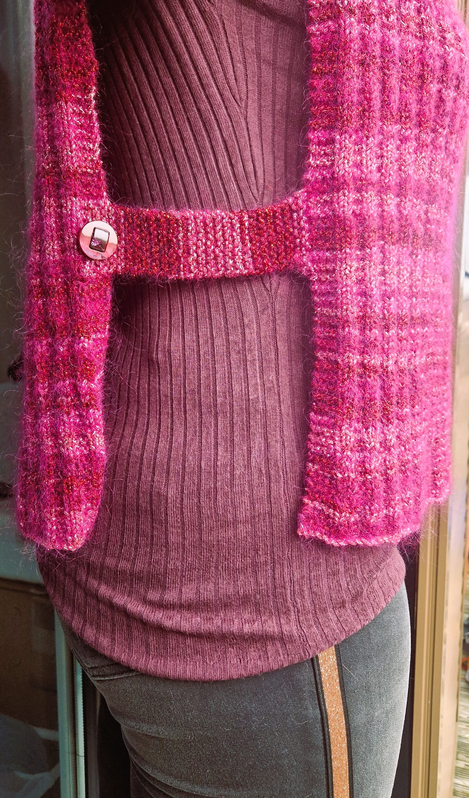 De mon cĂŽtĂ©, jâai souhaitĂ© tricoter en cĂŽtes 2/2 plutĂŽt que des demi-cĂŽtes anglaises. Pour le lien qui relie le dos et le devant, je nâai pas voulu faire la mĂȘme chose que le modĂšle initial, mais plutĂŽt une lĂ©gĂšre liaison au point mousse afin quâaucun lien ne pende dans le vide, avec un joli bouton rond scintillant en dĂ©coration.