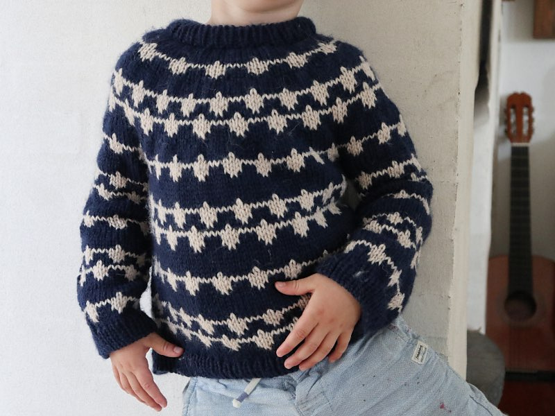 Le pull bleu marine et couleur sable est tricoté en Carpe Diem de Lang Yarns, la laine d’alpaga la plus douce et la plus agréable, idéale pour les pulls d’enfants car elle ne gratte pas.