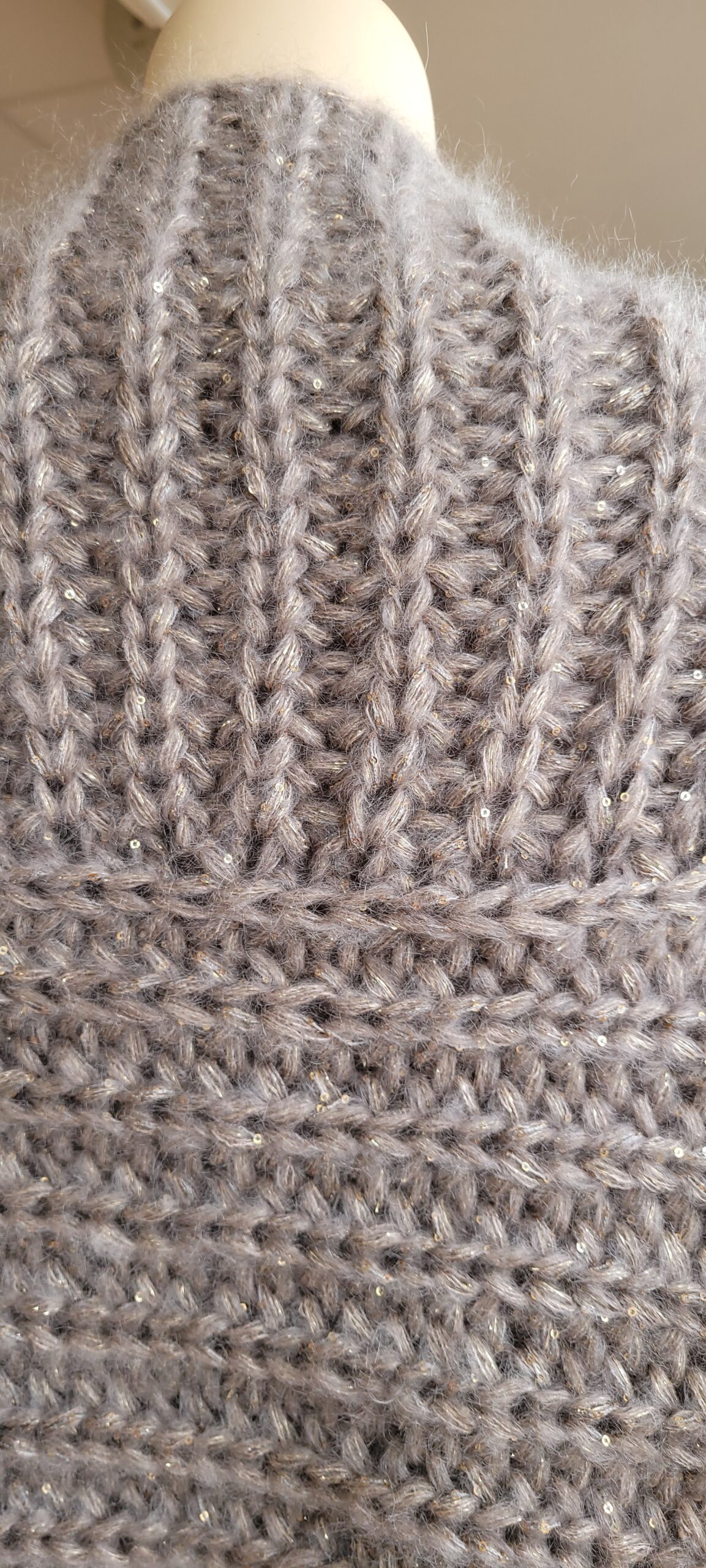- Tailles S-M : 13 pelotes de laine Delizia de Lang Yarns coloris 0097 + 6 pelotes de Paillettes de Lang Yarns coloris 0097