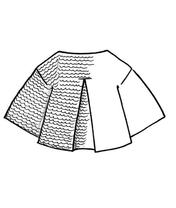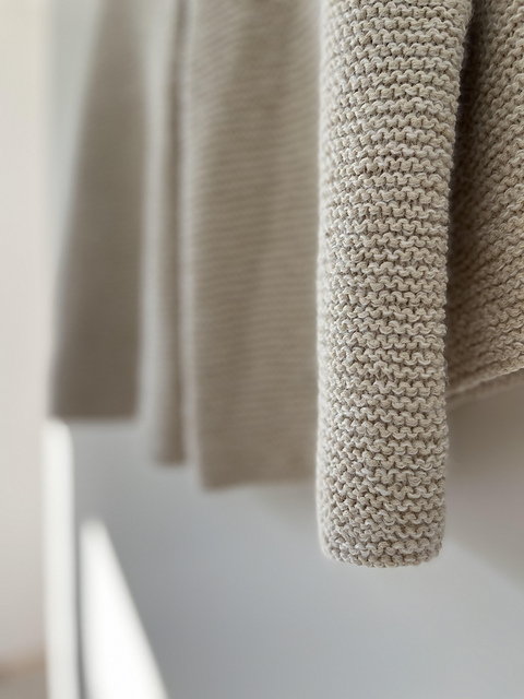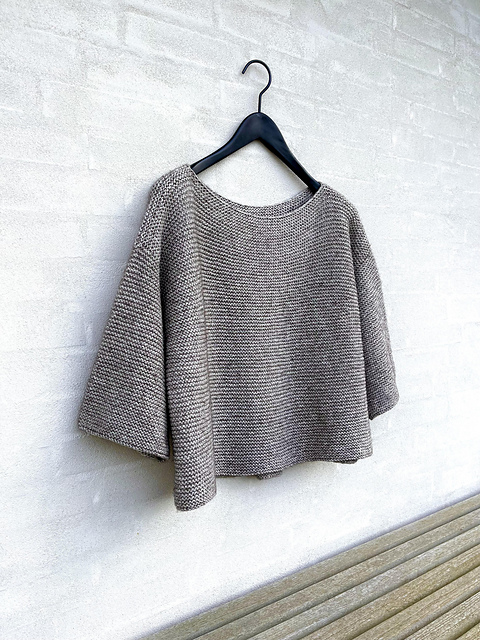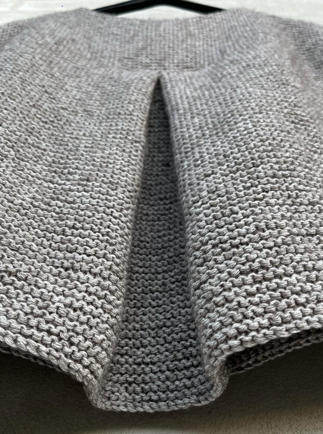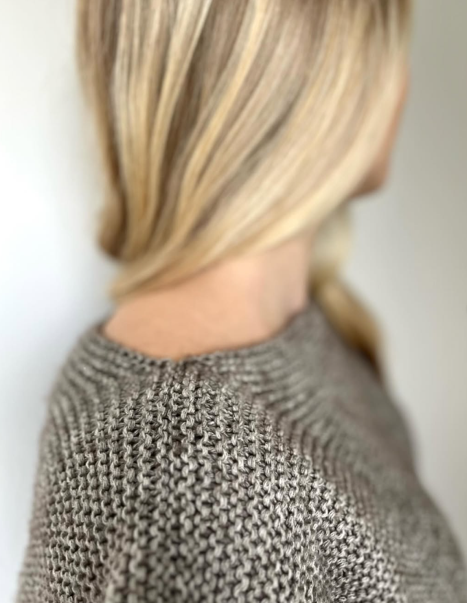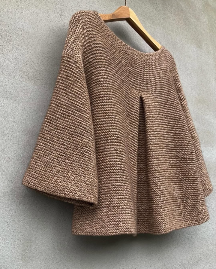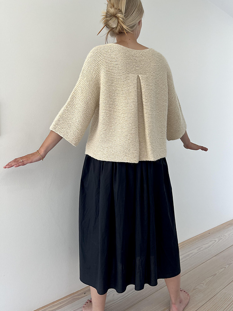 Il tricote de haut en bas, en top down. L’empiècement est tricoté en allers-retours avec des rangs raccourcis sur la poitrine. Des mailles supplémentaires sont montées pour former le pli du dos (le pli est crocheté une fois le corps terminé). Le corps est assemblé sous les emmanchures et tricoté au point mousse en rond avec des rangs raccourcis pour éviter les mailles envers. Les mailles des manches sont relevées autour des emmanchures et tricotées de haut en bas au point mousse en rond avec des rangs raccourcis pour éviter les mailles envers, comme pour le corps.